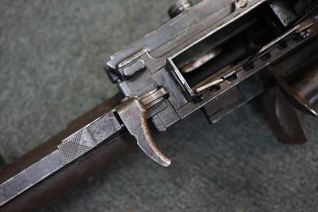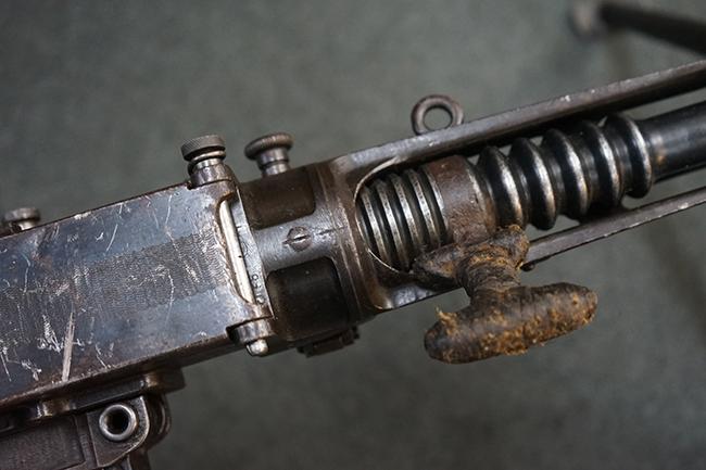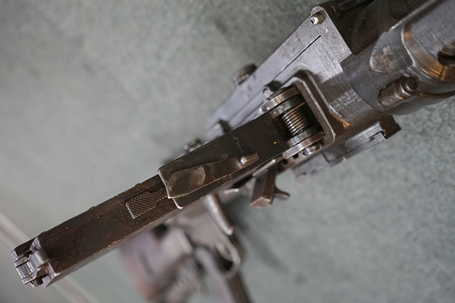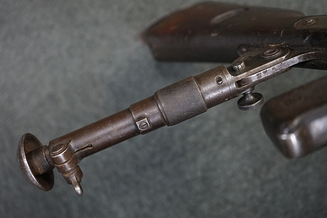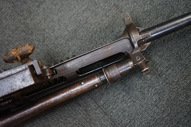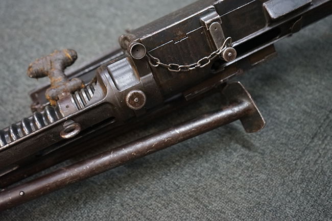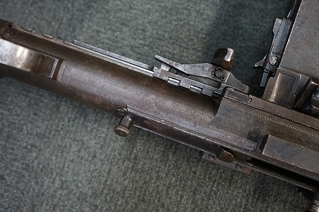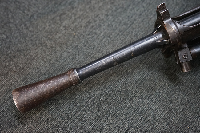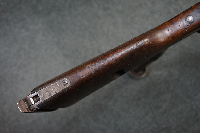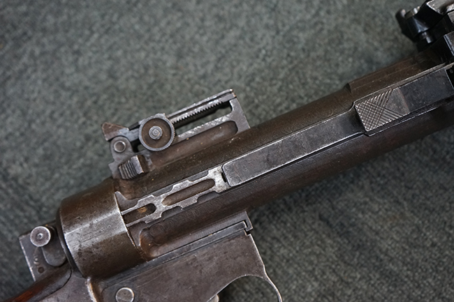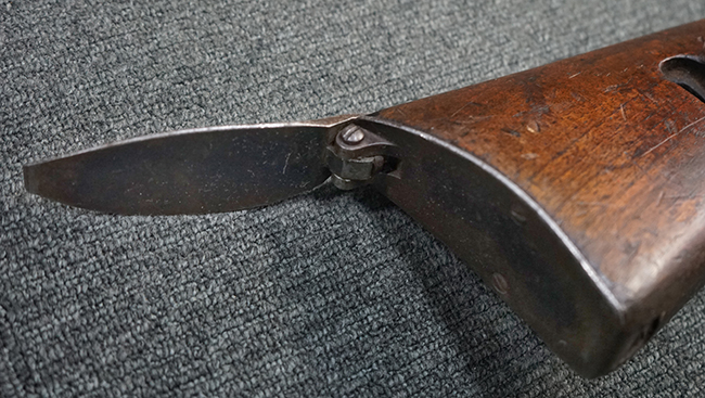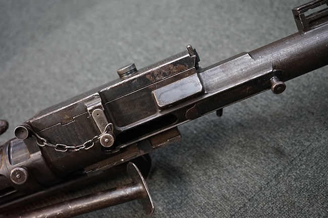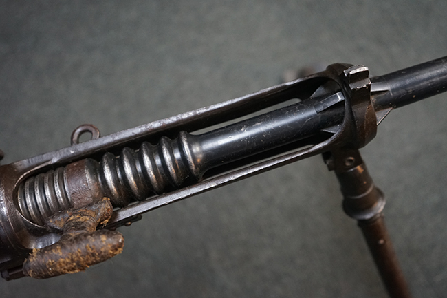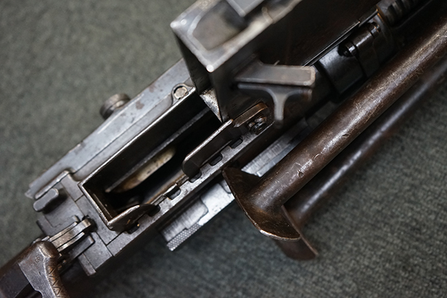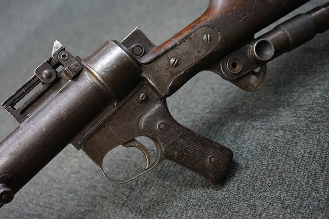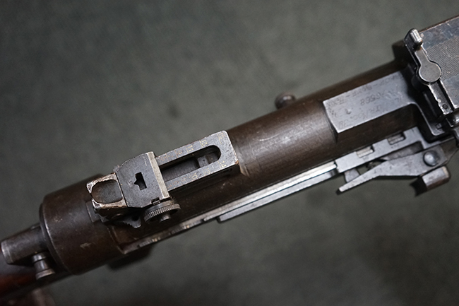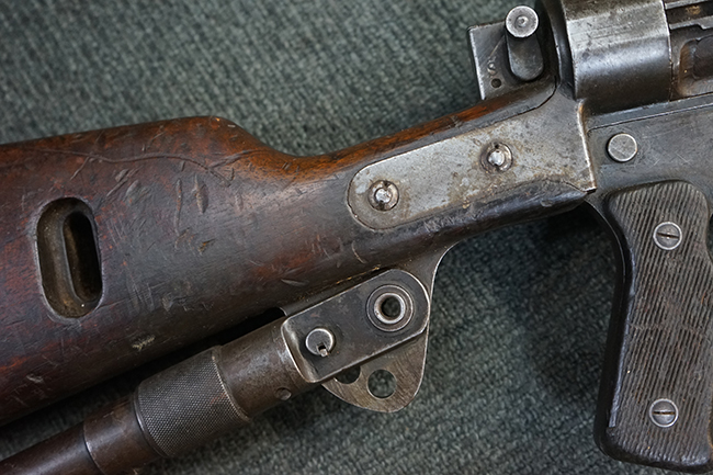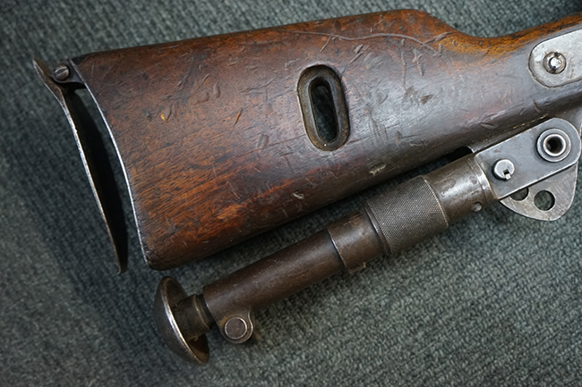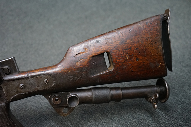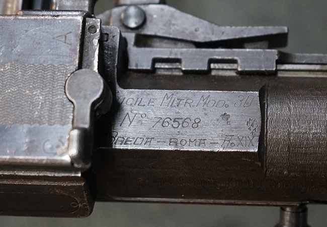 本品のレシーバー上面にはシリアルNo.の他、「MITR LEGG MOD.30」のモデル名や「BREDA -ROMA-」のメーカー刻印、ファシスト暦による製造年を示す刻印が入っています。 本品はバット・ストック下部に折り畳み式の一脚を備えたタイプです。