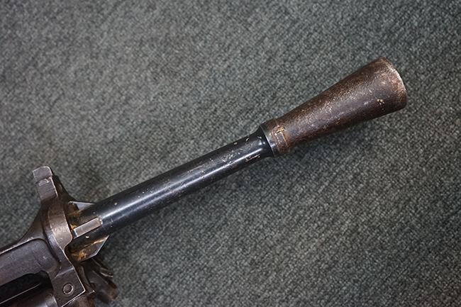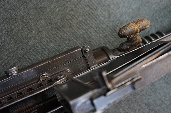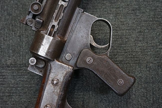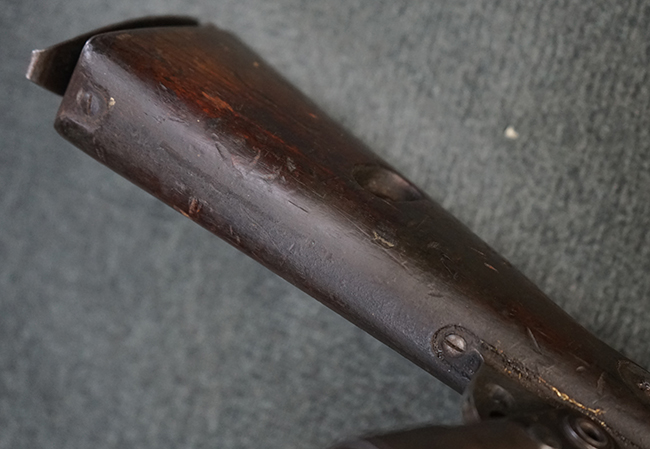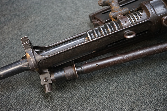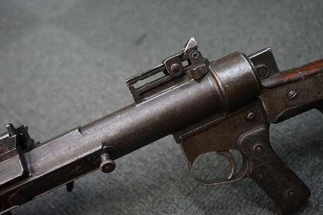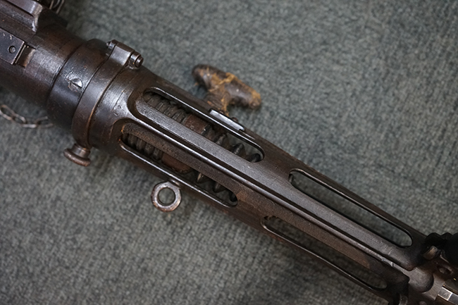 本品は適度に使い込まれたコンディションとなっており、金属部は全体にやや打ち傷や擦れの他、一部経年による褪色や表面錆等が見受けられますが、全体として大きな欠損等は見受けられず、概ねしっかりとした状態が保たれています。 木製のグリップやバット・ストックについても、全体にやや打ち傷や線傷が見受けられ、若干のひびや欠けが見られる場合がございますが、現状大きな破損や欠損等は見受けられません。 フラッシュ・ハイダーに若干の変形が見られる場合がございます。 リア・サイトの調整やショルダー・レストの開閉、二脚及びストック下部の一脚の展開、特徴的な弾倉の折り畳み操作については問題なく行う事が可能です。 尚、付属のマガジンは一部が固定されています。