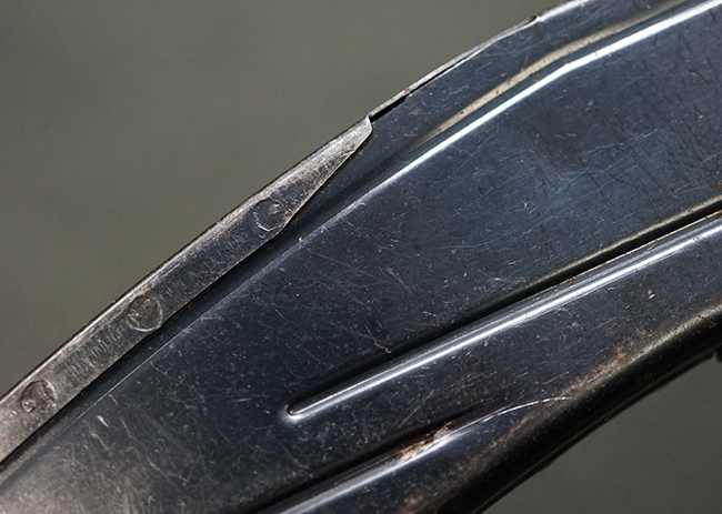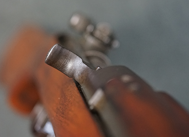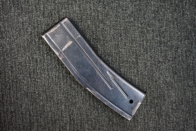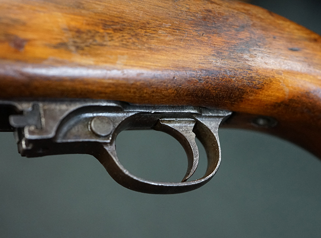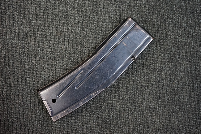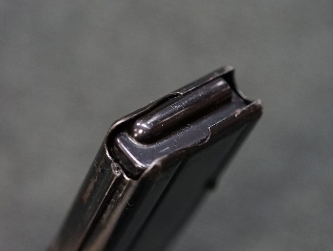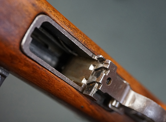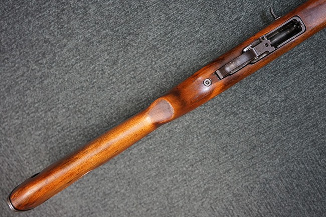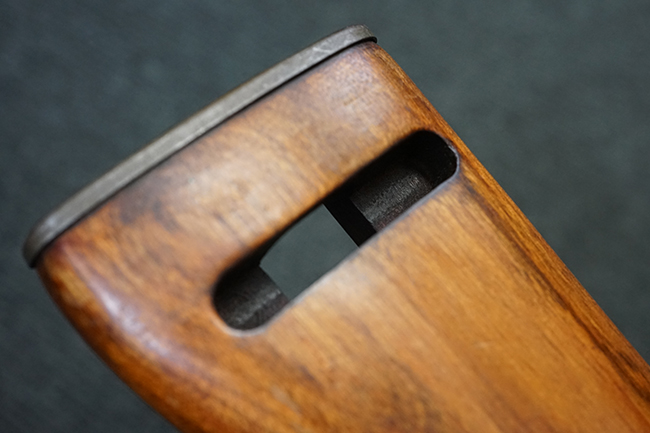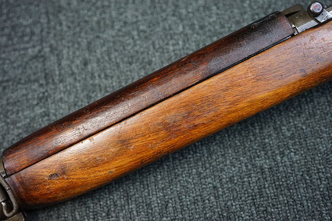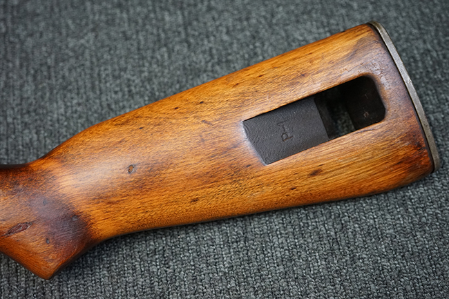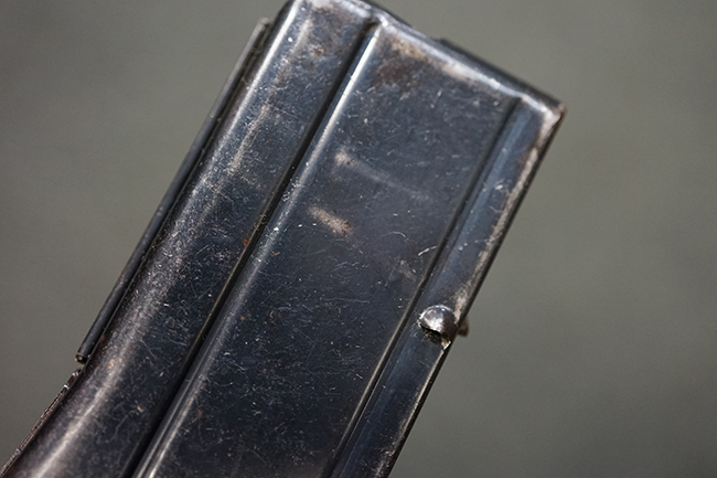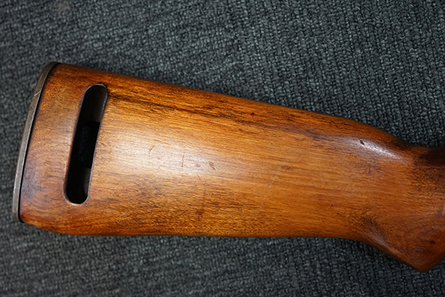 本品の機関部や銃身といった金属部は全体に適度な使用感が見受けられ、やや時代錆や擦れ、経年による褪色が見受けられるものの、目立った欠損等は見られず、概ねしっかりとした状態が保たれています。 木製銃床については、全体に仕上げ直しが施され、やや打ち傷や線傷、一部補修痕の他、機関部付近の銃床右側面やアッパー・ハンドガードに一部ひびが見られるものの、大きな破損等は見られず、概ねしっかりとした状態が保たれています。 アッパー・ハンドガードの取り付けにはやや遊びが目立ちます。 バット・プレート部についても、全体に経年による褪色や打ち傷、時代錆が表れているものの、現状目立った変形等は見られません。 尚、バット・プレートの取り付けにはややがたつきが見られます。 リア・サイトの調整やマガジンの着脱については問題なく行う事が可能です。 セーフティ・レバーの切り替えについても問題なく、安全位置でトリガーがロックされます。 付属のマガジンは30連タイプで、やや打ち傷や擦れ、表面錆の他、若干のアタリが見られるものの、大きな変形等は見られず、オリジナルのブルー仕上げも比較的残っています。 尚、マガジン・スプリングは入っています。