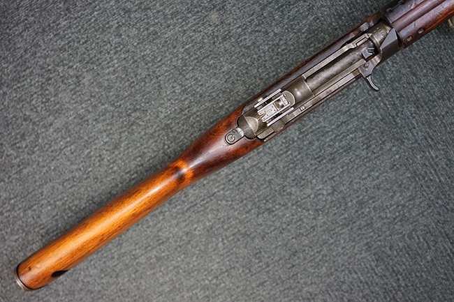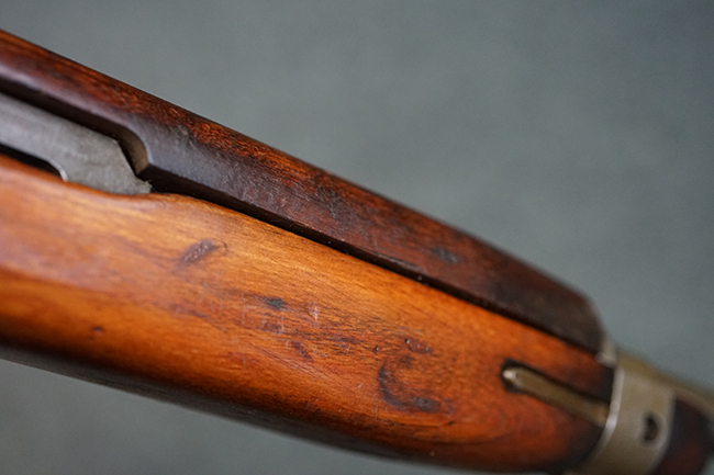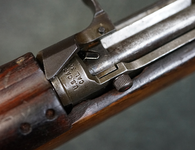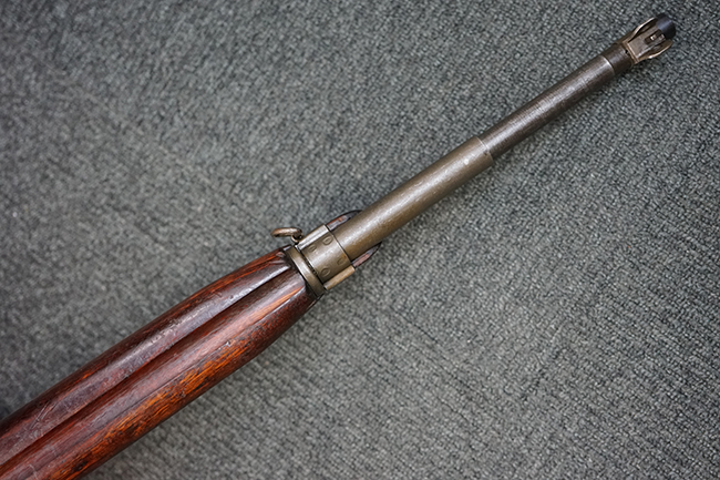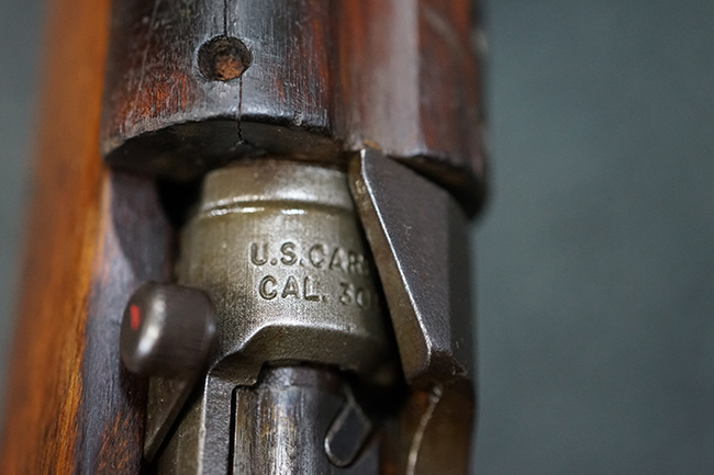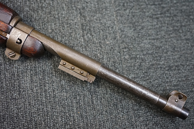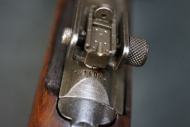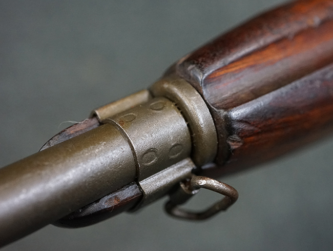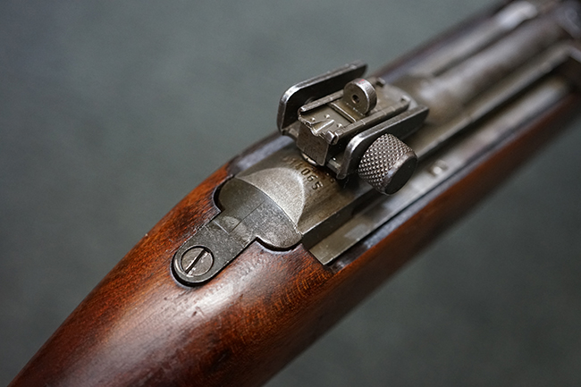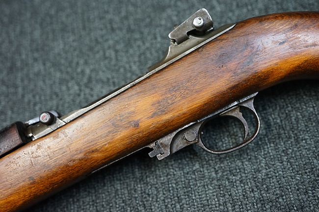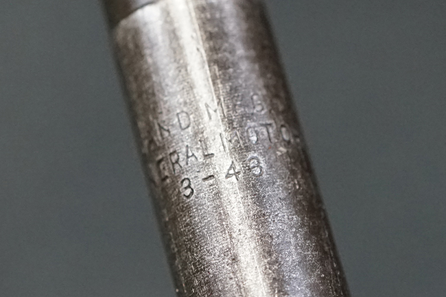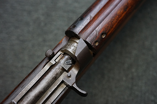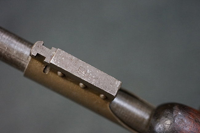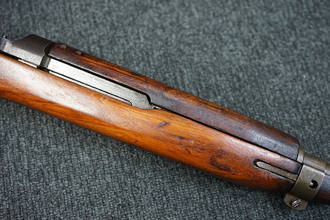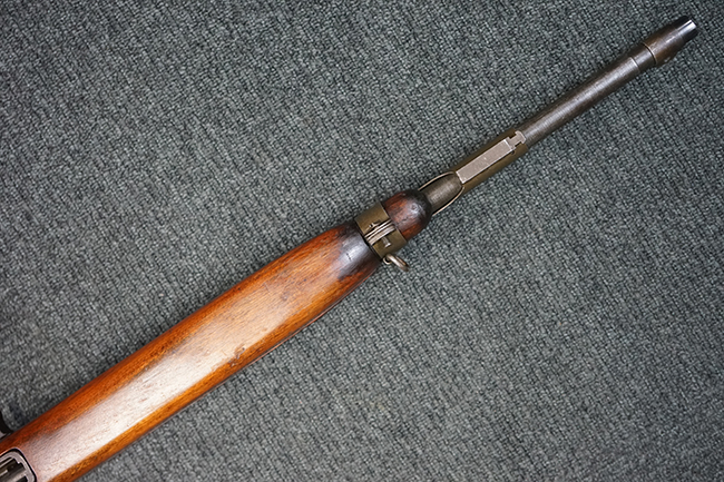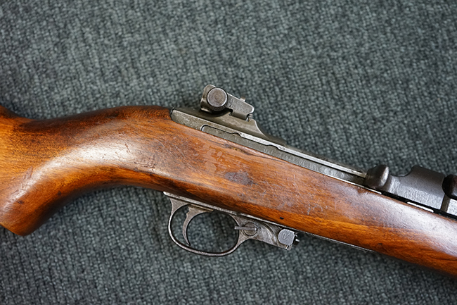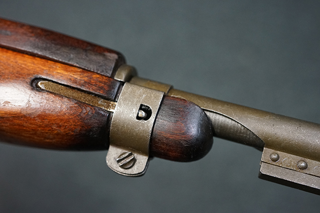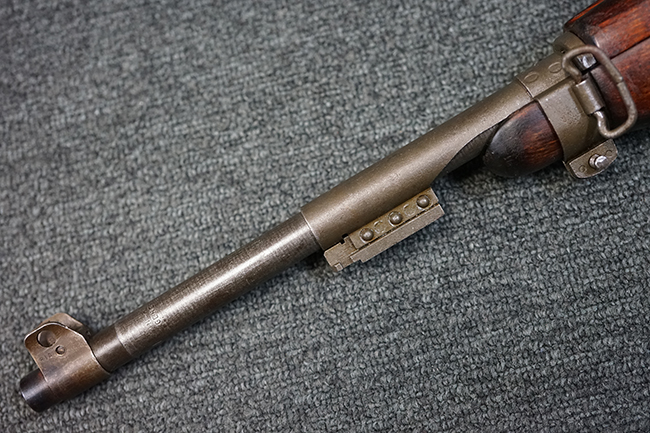 本品のレシーバー後端上面にはシリアルNo.3414065に加えて、やや確認し難いものの「SAGINAW SG」のメーカー刻印が入っています。 尚、銃身先端付近には1943年3月にインランド社で製造された事を示す「INLAND MFG. DIV. GENERAL MOTORS 3-43」の刻印も入っています。 薬室上の刻印は「U.S. CARBINE CAL. .30」に続くモデル名部分がオペレーティング・ハンドルに隠れており、確認は出来なくなっています。