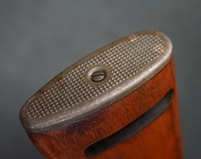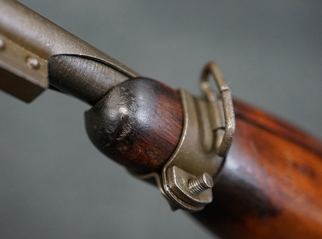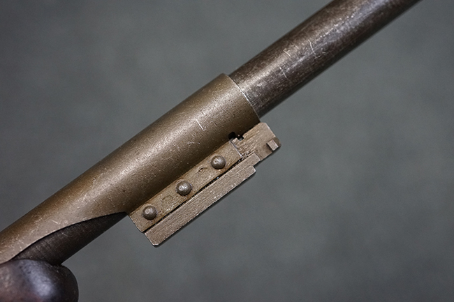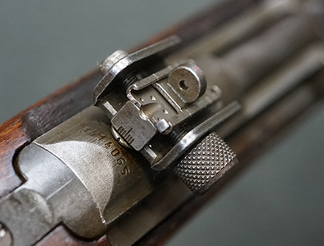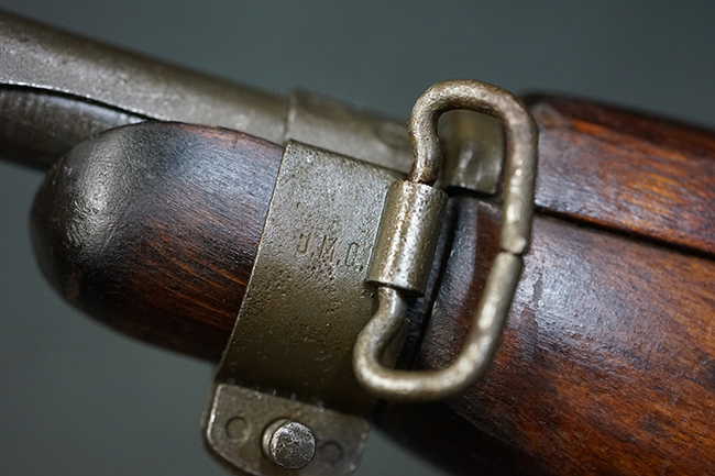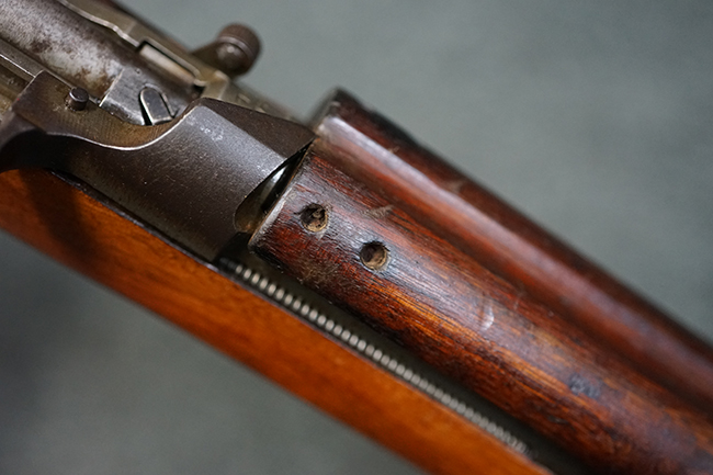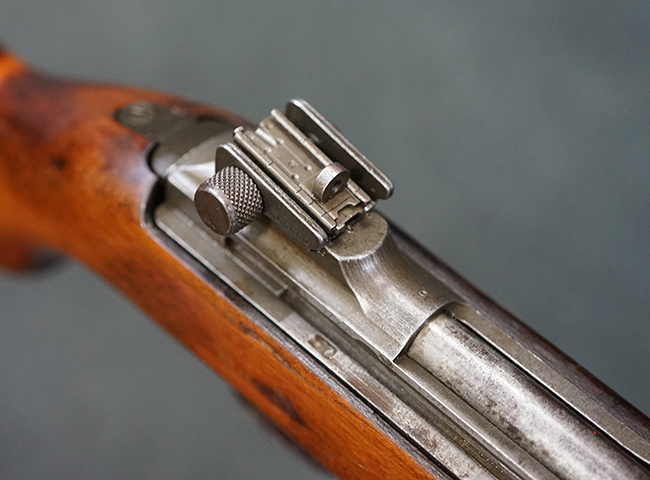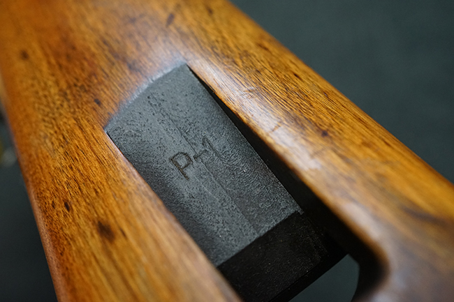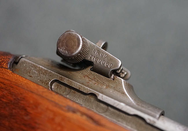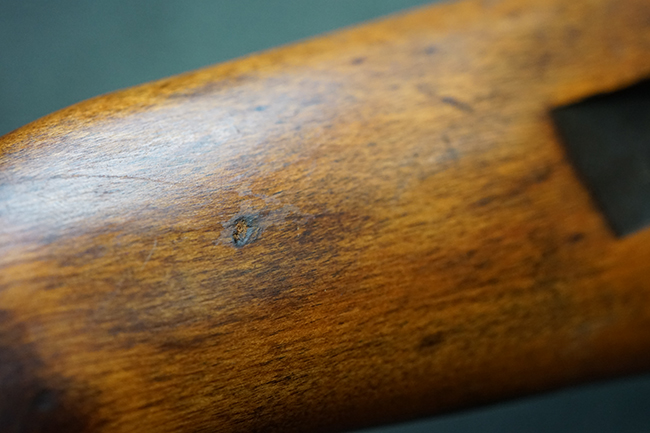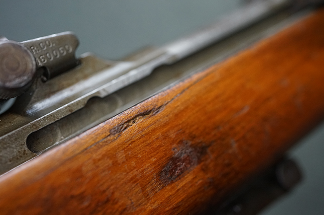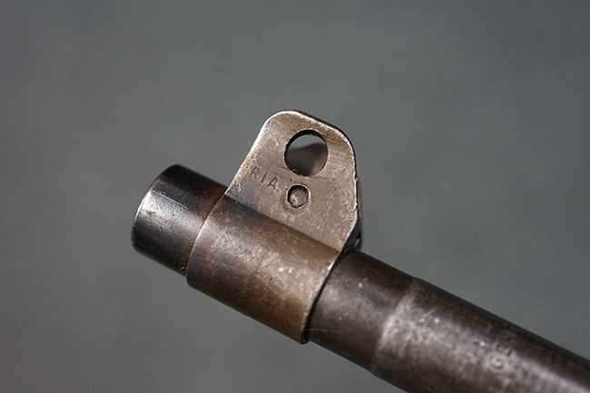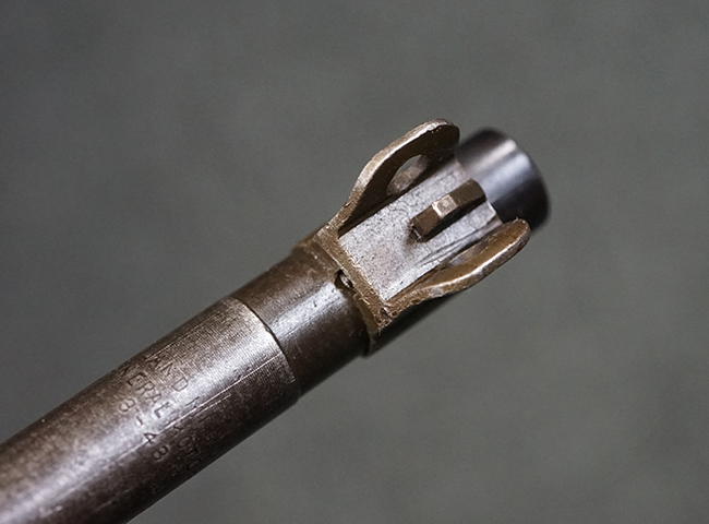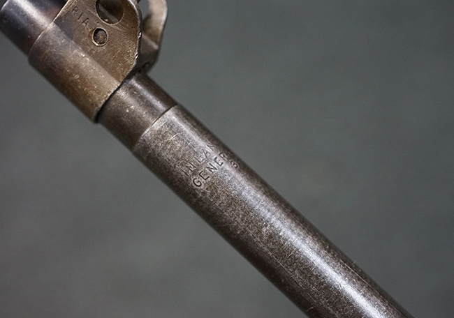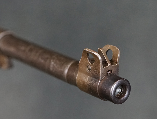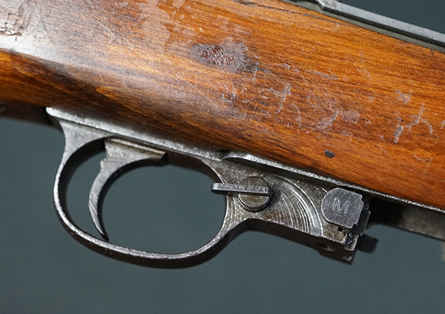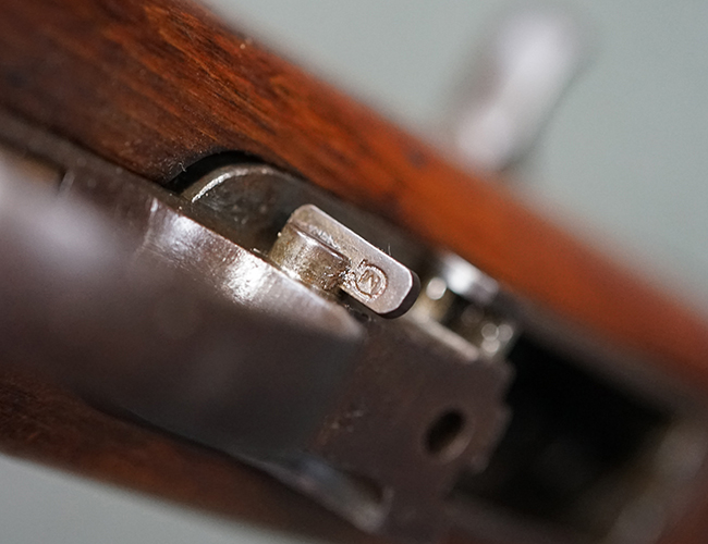 本品のレシーバー後端上面にはシリアルNo.3414065に加えて、やや確認し難いものの「SAGINAW SG」のメーカー刻印が入っています。 尚、銃身先端付近には1943年3月にインランド社で製造された事を示す「INLAND MFG. DIV. GENERAL MOTORS 3-43」の刻印も入っています。 薬室上の刻印は「U.S. CARBINE CAL. .30」に続くモデル名部分がオペレーティング・ハンドルに隠れており、確認は出来なくなっています。