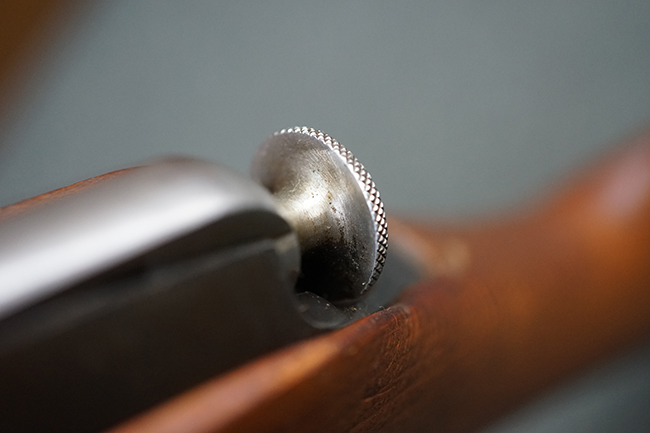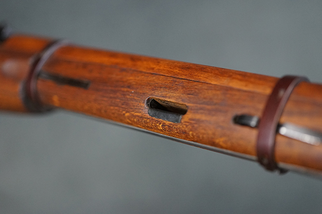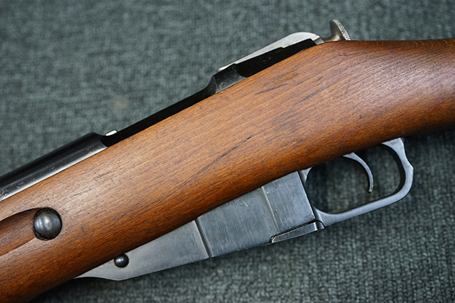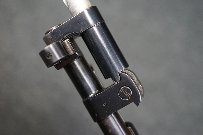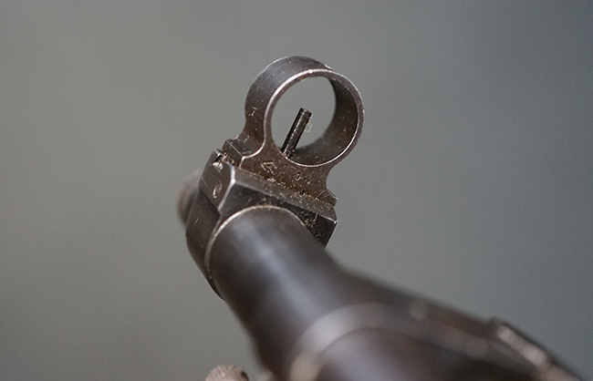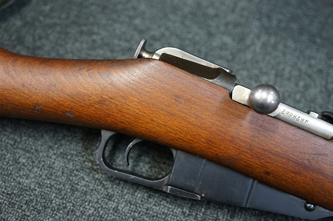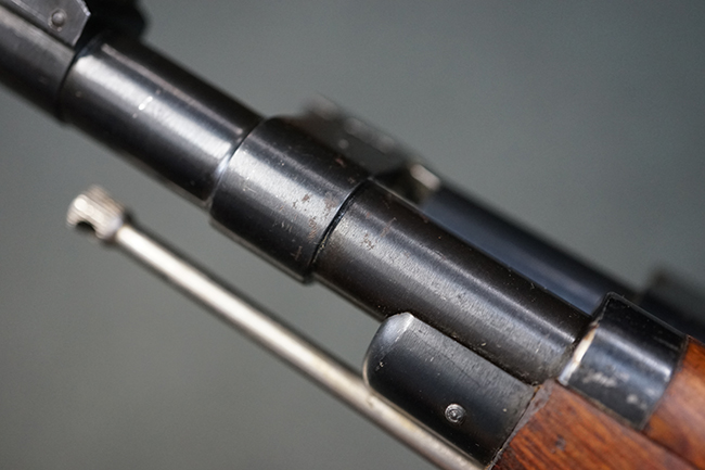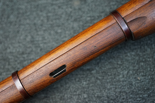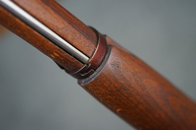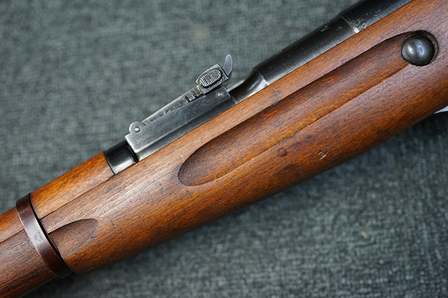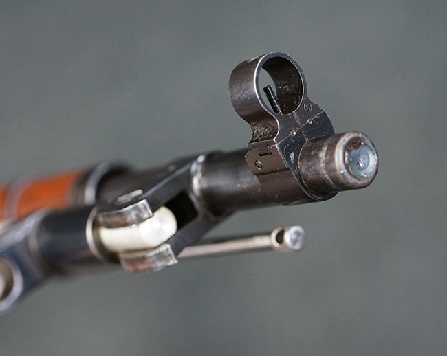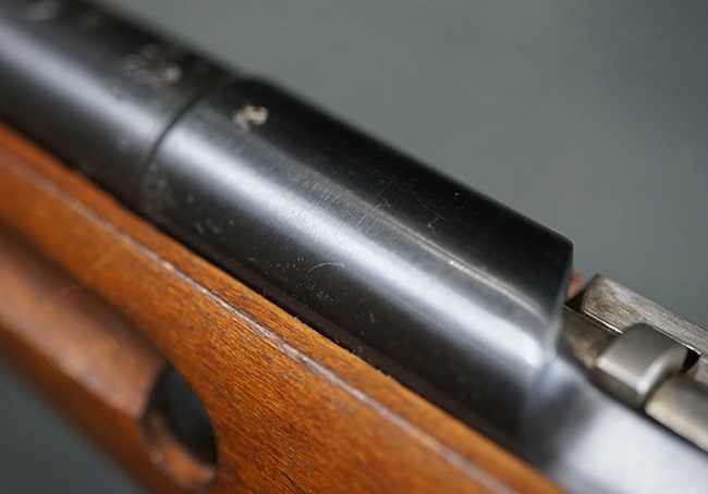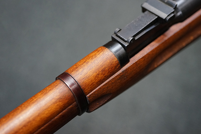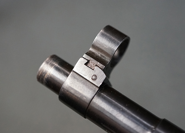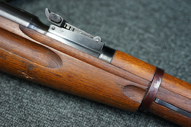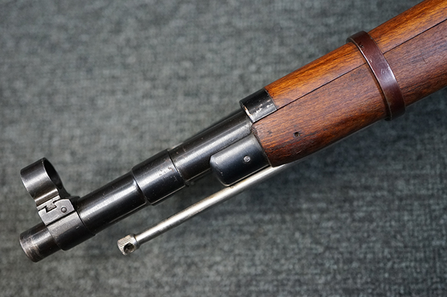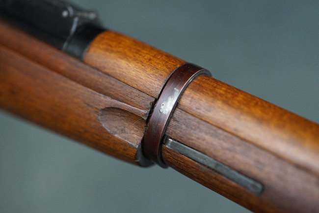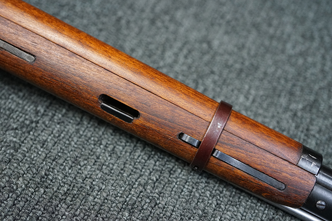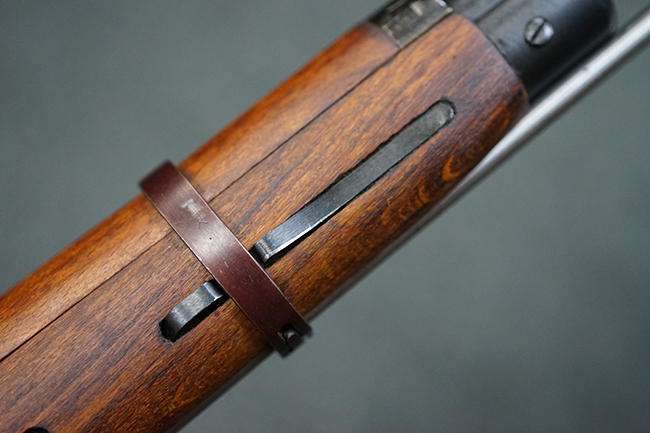 そのようなモシンナガン小銃のバリエーションの一つとして開発されたのがモシンナガン M1938 騎兵銃で、主に砲兵部隊や後方部隊等に配備されました。 M1891/30歩兵銃に比べて銃身や銃床前部、ハンドガードが短縮化された他、着剣機能が省略されています。 また、銃身の短縮に伴いクリーニング・ロッドも短縮された他、リア・サイトの最大射程についてもM1891/30歩兵銃の2,000mに対してM1938騎兵銃では1,000mへと変更されていました。 更に、M1891/30歩兵銃では銃身にフロント・サイト・ベースがろう接によって直接取り付けられていましたが、M1938騎兵銃ではスリーブ状のフロント・サイト・ベースを銃身に圧入した後、ピンにより側面から固定する構造へと変更されています。 M1938騎兵銃は1939年から1945年にかけて主にイジェフスク造兵廠で製造された他、ツーラ造兵廠でも1940年と1944年に製造が行われました。