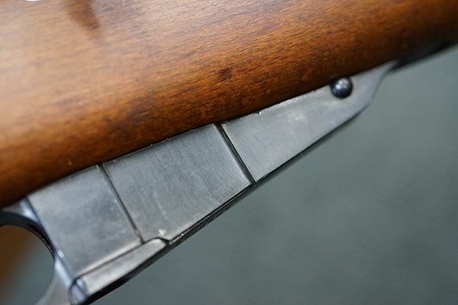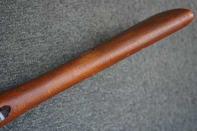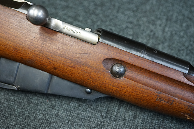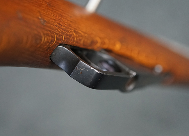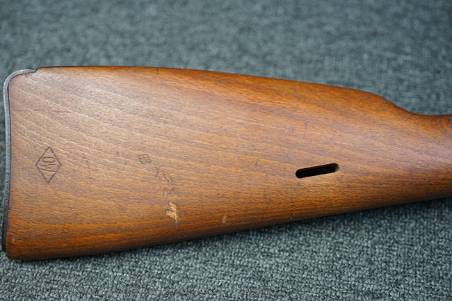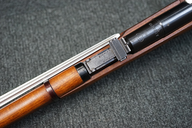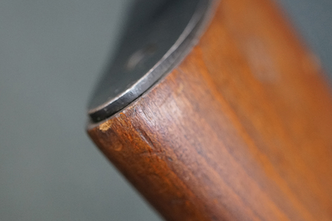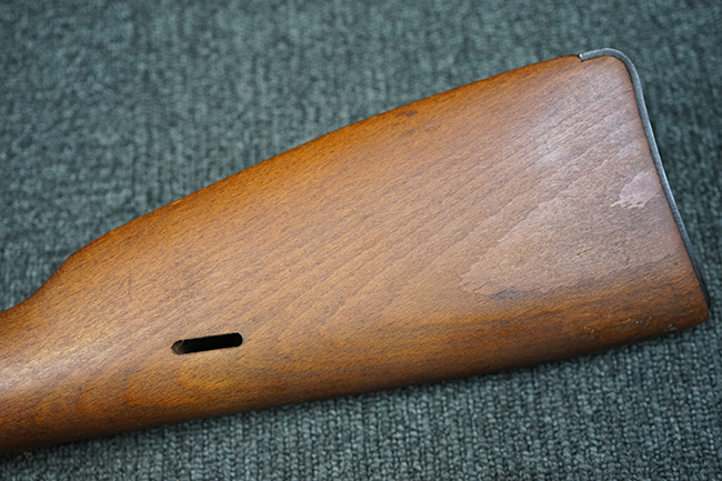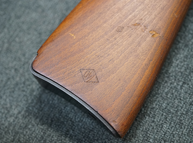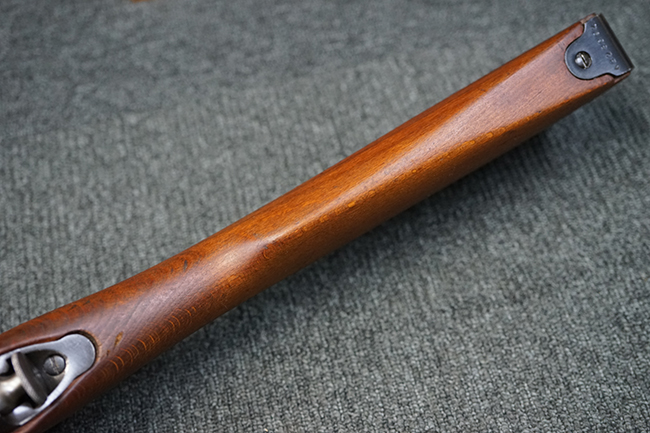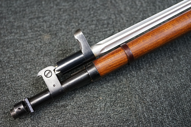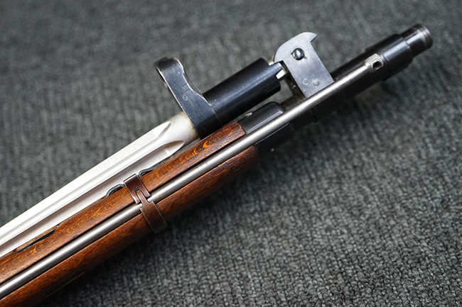 本品は全体に使用感が少なく、金属部については若干の擦れや僅かな表面錆を除いて目立った破損や欠損等も見られず、大部分にブルー仕上げが残った良好な状態が保たれています。 白磨きのボルトについても若干の時代錆が表れているものの、こちらも目立った朽ち込み等は見られず、コンディションは良好です。 木製銃床についても、やや打ち傷や表面的な欠けが散見されるものの、こちらも目立った破損等は見られず、概ね良好な状態が保たれています。 傷み易いバット・プレートについては、角の部分にやや表面錆痕や擦れが見られるものの、現状目立った変形等は見られず、銃床への取り付けもガタつきもなくしっかりとしています。 折り畳み式の銃剣はアルミ合金製の非常に精巧な合法復刻品で、オリジナルと同じように起剣が可能です。 尚、オリジナルの銃剣は付属しません。 リア・サイトの調整についても問題なく行う事が可能です。 尚、弾倉内のバネ及びフォロワーは入っていません。 クリーニング・ロッドが付属します。