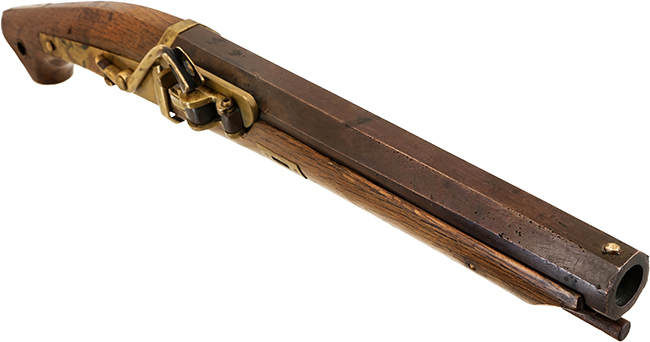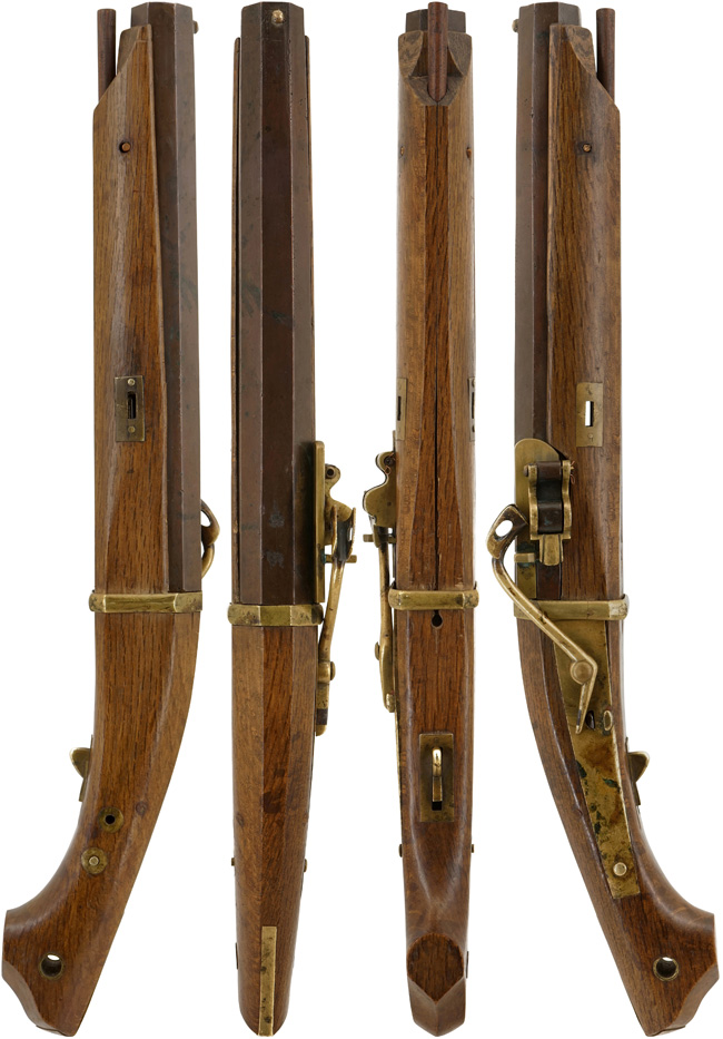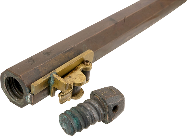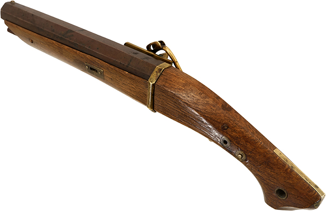 本品の筒 (銃身) は青銅の鋳造製で防錆効果が高く瀬戸内の水軍が使用したのではないでしょうか。 銃身には大きな欠損等は見受けられず、非常にしっかりとした状態が保たれています。 銃身下部の目釘金具と銃床の目釘穴の位置は2箇所とも一致しています。