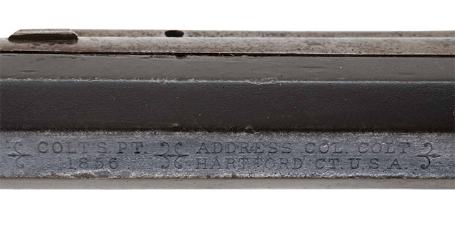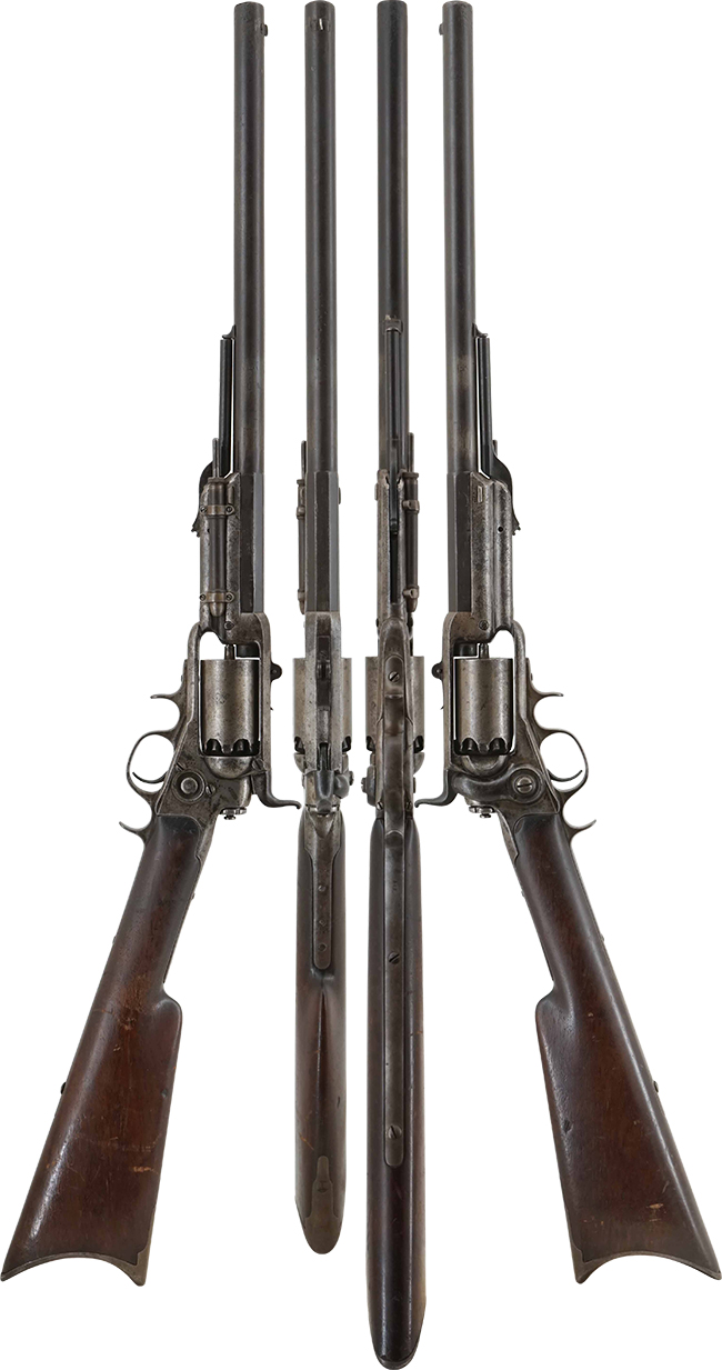 コルト "ニュー・モデル" リボルビング ライフルとも呼ばれる、コルト社が1855年から1864年頃にかけて製造した初期の連発式ライフル/カービンです。 コルト ニュー・モデル リボルビング・ライフルは、機構的にはElisha K. Rootの設計によるコルト M1855 サイド・ハンマー ポケット・リボルバーを拡大したもので、.36口径から.56口径までの口径の異なる様々なモデルが存在し、さらに15インチから30インチまでの銃身長の異なるライフル・モデル及びカービン・モデルが軍用若しくはスポーツ用として製造されました。本品は.36口径、銃身長が18インチのカービン・モデルです。