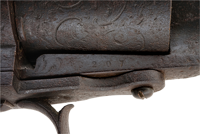フレーム右側面にルフォーショー社のプルーフ刻印(中折れ式古式銃ロゴにLFの文字、これはフランス製の本家ルフォーショー社製の品だけに打たれている刻印です)とシリアル No.207が入っています。