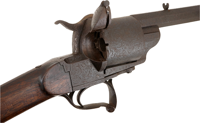 本品はフランスのルフォーショー本社で1860年代後半に製造された6連発 カニ目打式のリボルビング・カービンです。 銃身を約58cmまで伸ばし、ピストル用のグリップ・フレームを外し、木製ストックを取り付けた当初からのオリジナル リボルビング・カービン・モデルです。 口径は15mmと非常に大きく、ピストル/ハンドガン・モデルでは到底保持できないような大口径になっています。