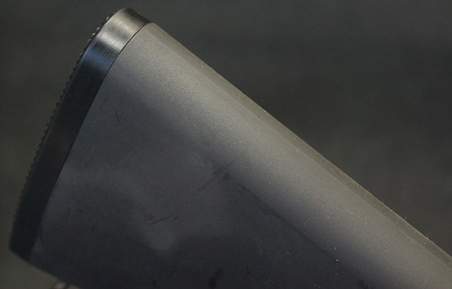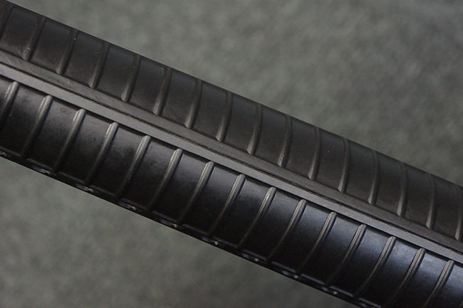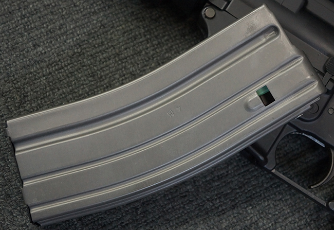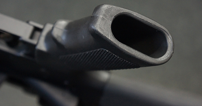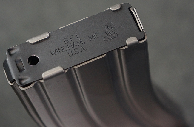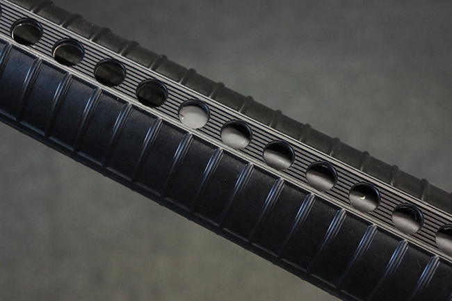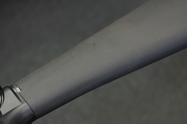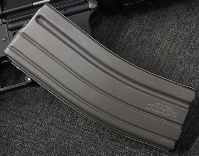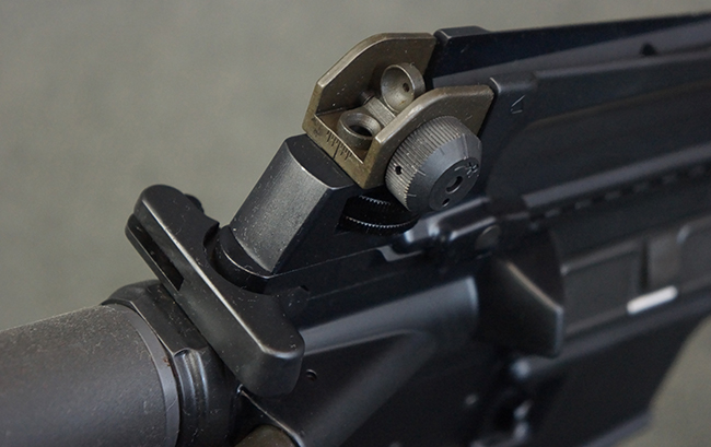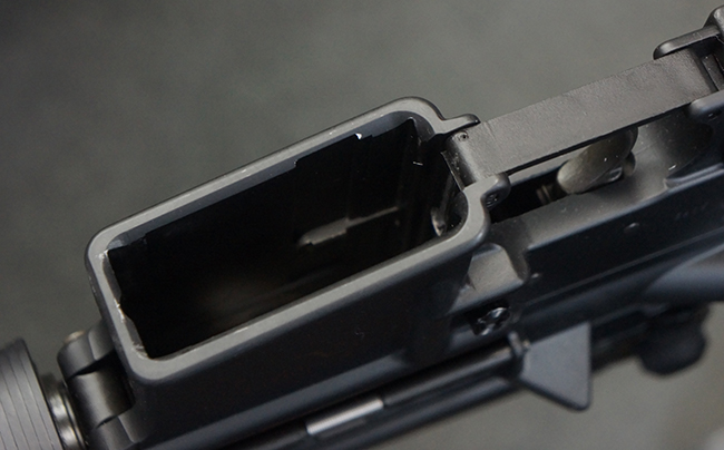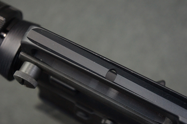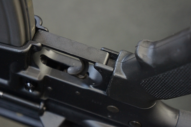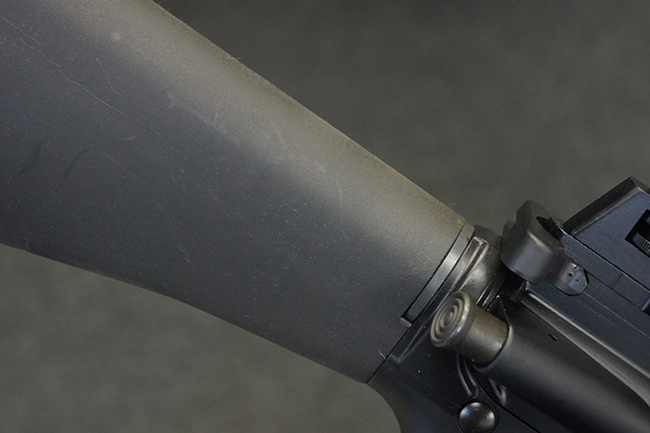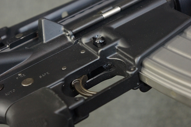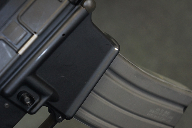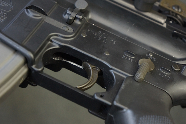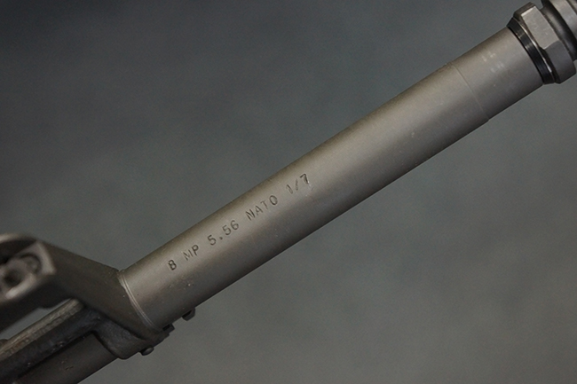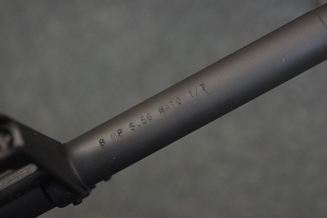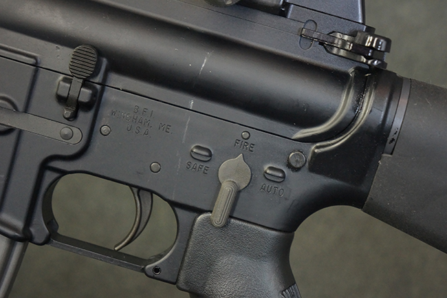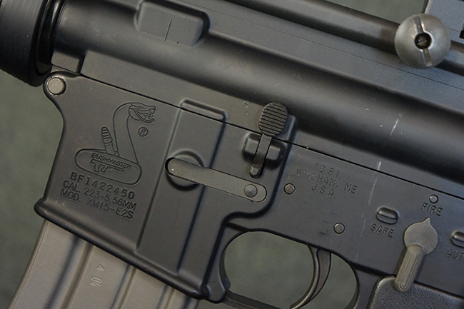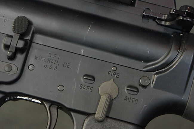 本品のマガジン・ハウジング左側面にはブッシュマスター社のロゴに加えて、シリアルNo.や「CAL. 223-5.56MM」の口径表示刻印、「MOD. XM15-E2S」のモデル名刻印が打刻されています。 また、ロア・レシーバー左側面には他にも「B.F.I. WINDHAM. ME. U.S.A.」のメーカー・アドレス刻印が入っています。 その他にも、銃身上面には「B MP 5.56 NATO 1/7」の刻印が確認出来ます。 本品はセレクティブ・ファイア・モデルのため、セレクターにはフル・オートマチック射撃のポジションが設けられています。