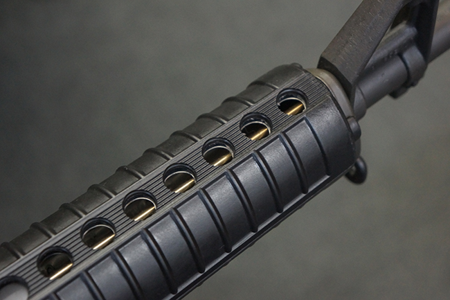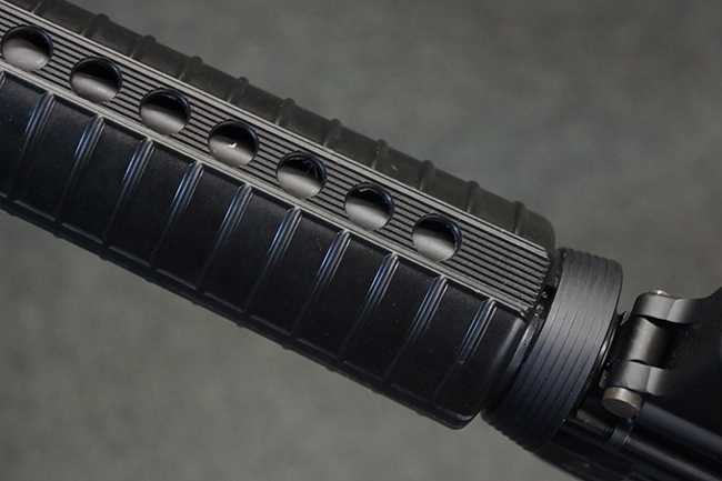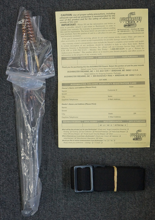 本銃もそのようなAR-15系クローンの一つで、ブッシュマスター社が製造するスタンダード・モデルのXM15のアッパー及びロア・レシーバーは、航空機グレードの7075T6鍛造アルミニウムにより製造され、銃身は4150スチールにより製造されています。 民間用に製造されたブッシュマスター XM15-E2Sシリーズには、16インチ銃身を備えたE2S Shortyと呼ばれるスタンダードなカービン・モデルの他、20インチ銃身を備えたターゲット・モデルや、M16タイプの長いハンドガードとフロント・サイト・ベースを兼ねたダミーのガス・ブロックを備えたE2S Dissipatorと呼ばれるモデル等が存在します。 また、XM15のバリエーションとしては他にも、7インチもしくは10,5インチの短銃身とフリー・フローティング構造のハンドガードを備え、ストックを廃したパトロールマン・シリーズ、アイアン・サイトを廃してレシーバーをフラット・トップとしたQRC (ORC) シリーズなど、多くのバリエーションが存在します。
