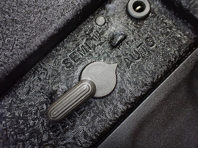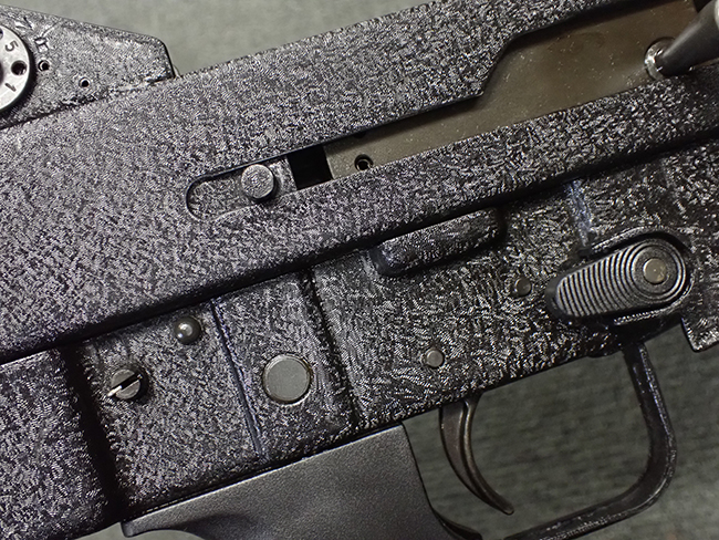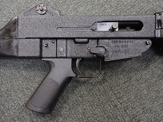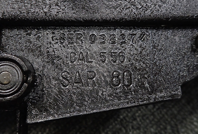 本品のマガジン・ハウジング右側面にはシリアルNo.038374に加えて「CAL.5.56 SAR80」のモデル名刻印が入っています。 本品はレシーバー上面にスコープ・マウント・ベースが装備されていないタイプです。