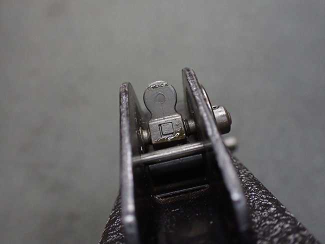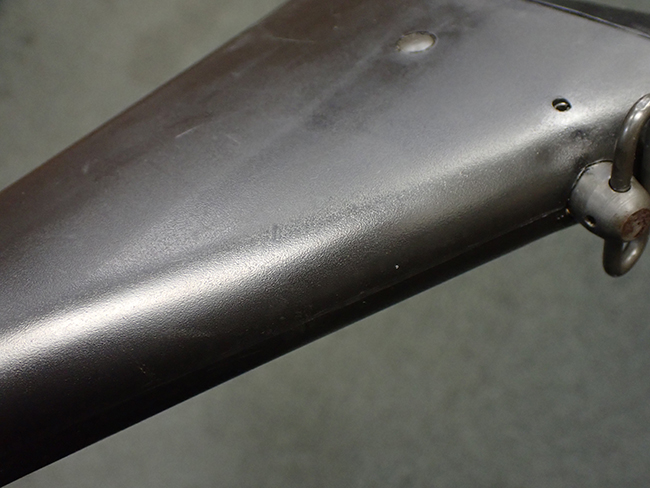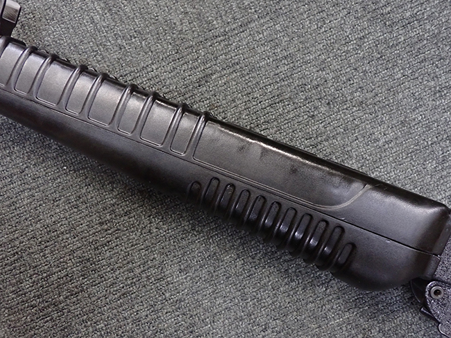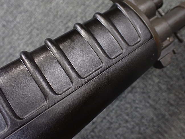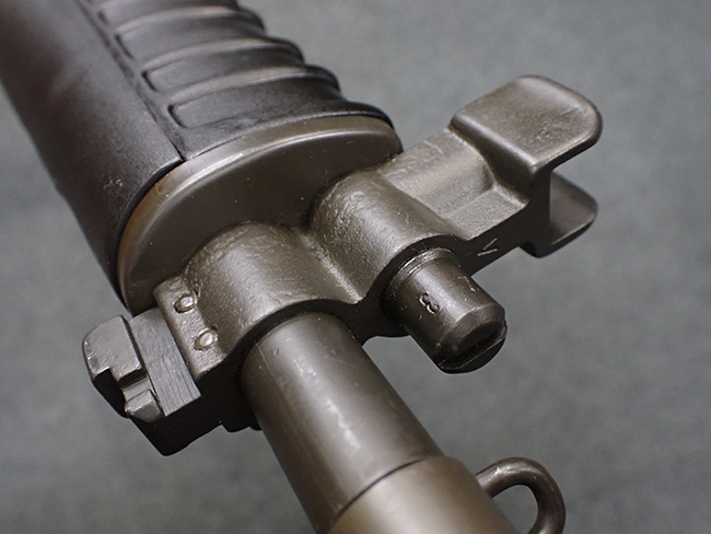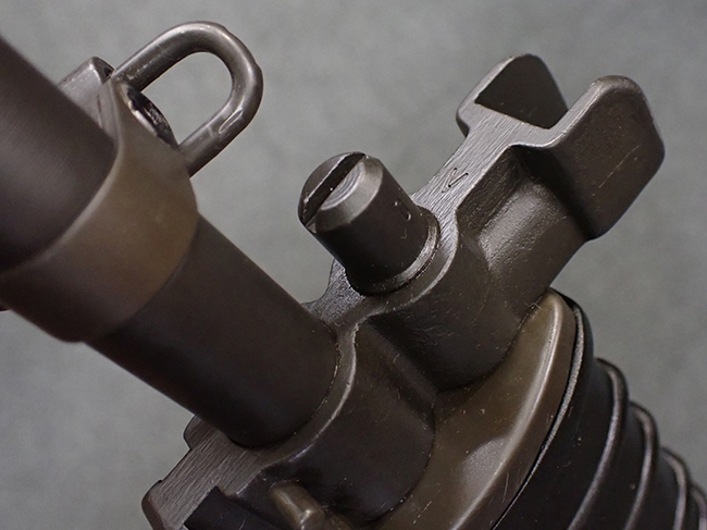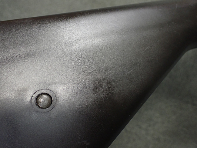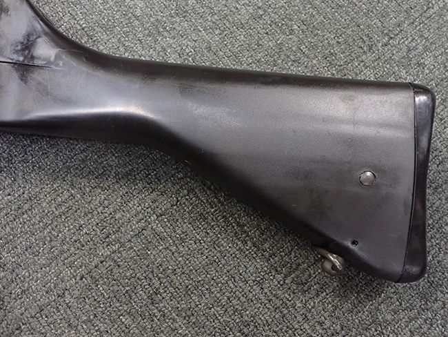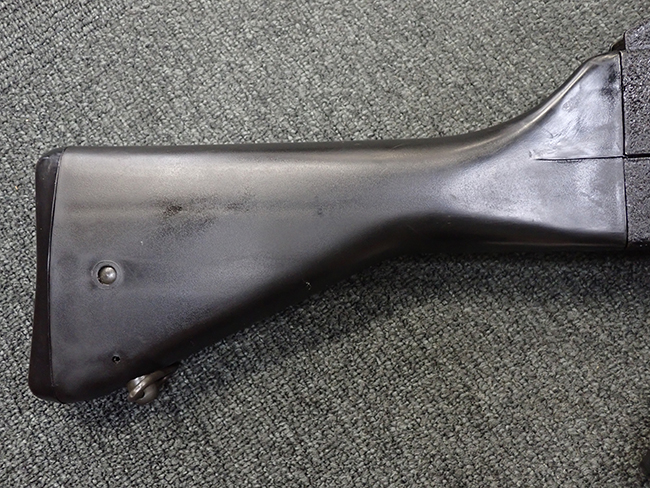 本品は全体に使用感も比較的少なく、SAR80の特徴であるスターリング短機関銃と同様のレシーバーのシボ塗装についても剥落等は最小限となっています。 ハンド・ガードやグリップ、バット・ストックといった樹脂部は保管上の若干の小傷や擦れ等は見受けられるものの、こちらも目立った欠損等は見受けられず、総じて良好な状態が保たれています。 ゴム製のバット・プレートについても若干の擦れを除いて目立った経年劣化等は見受けられません。