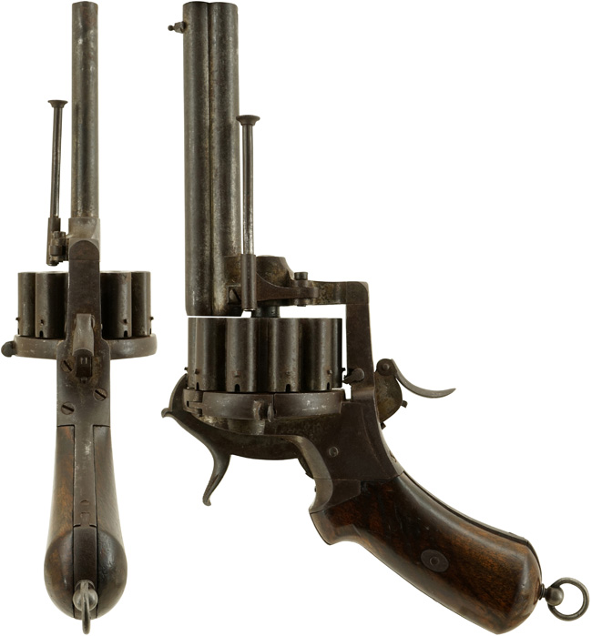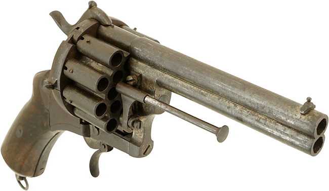 ルフォーショー (Lefaucheux) リボルバーはピン・ファイア式 (カニ目打ち式) の金属製薬莢を使用するリボルバーで、フランス人のユージーン・ルフォーショーによって1854年に考案され、フランス及びベルギーでパテントが取得された後、1860-70年代頃にかけて様々な製品が製造されました。 ピン・ファイア式は従来のパーカッション (管打ち) 式に比べて装薬や弾頭、そして雷管が脱落する心配がなく、迅速に装填が可能といった長所がありました。