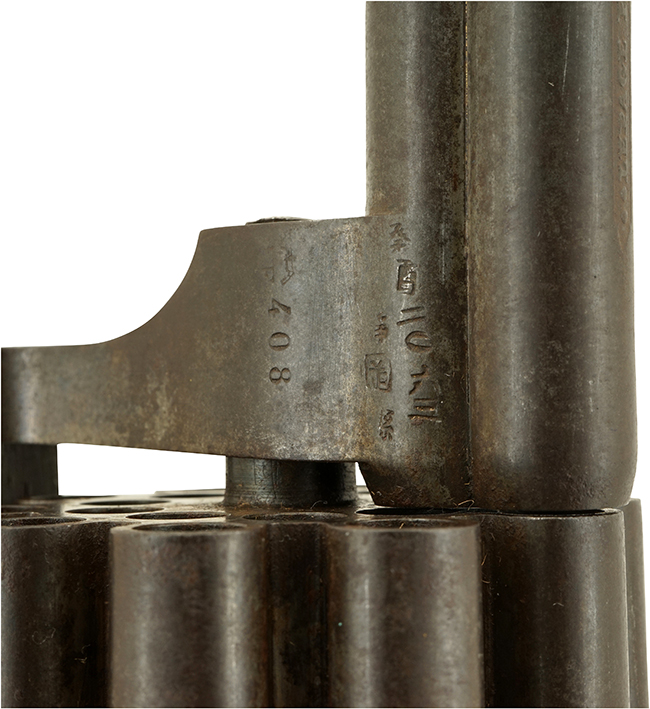 本品の銃身やシリンダーといった金属部は全体に当時の仕上げが残っており、やや時代錆は見受けられるものの、大きな欠損等は見受けられず、概ね良好な状態が保たれています。 銃身基部 (ヨーク部分) 左側面には「癸酉二〇六三静岡縣」の刻印があります。 ウォールナット製と思われる木製グリップについては、僅かな打ち傷等は見られますが、大きな割れや欠け、取り付けのガタつき等は見受けられず、濃い茶色の艶のある仕上げも比較的残っています。 グリップ下部のランヤード・リングの取り付け金具は取り付けに僅かな遊びが見られるものの、本体への固定自体はしっかりとしています。 銃身及びフレームの組付けについてはガタつき等は殆ど見られません。