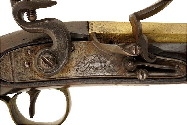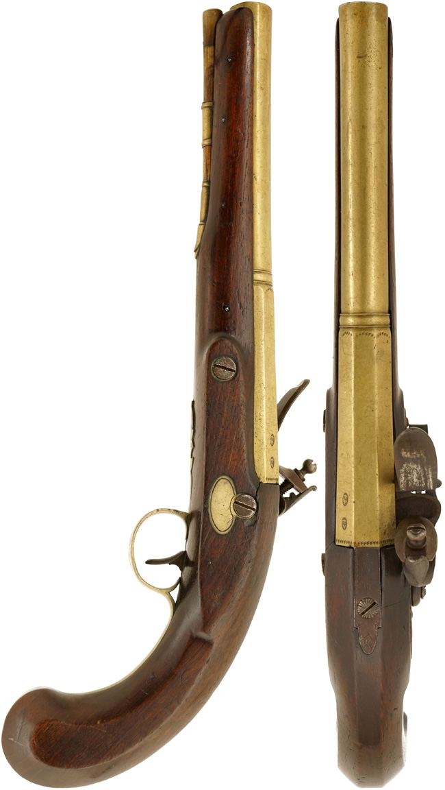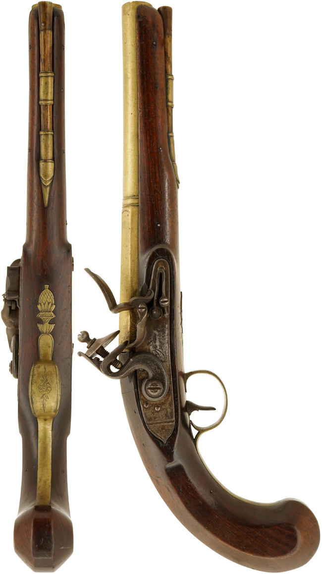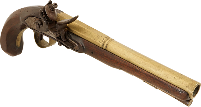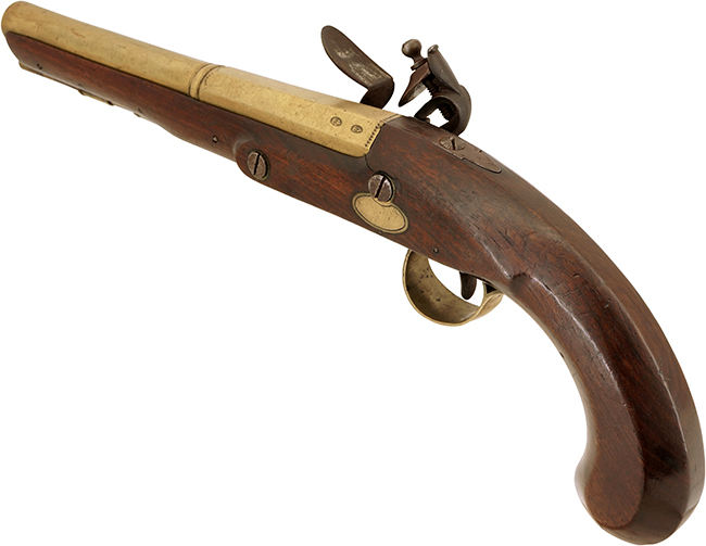 本品は英国リバプールの銃工であるJohn Parr (ジョン・パー) 社により製造された、燧石式 (すいせきしき) /火打石式 (フリント・ロック=Flintlock) 拳銃です。 火打石式はフリント・ロックとも呼ばれる点火方式の1つで、1620年頃に開発されたとされています。 より信頼性の高いパーカッション・ロック式 (雷管式) が1840年頃より主流となるまでの約200年間に、大型の軍用銃から小型の護身用拳銃まで様々な小火器の撃発機構として使用されました。