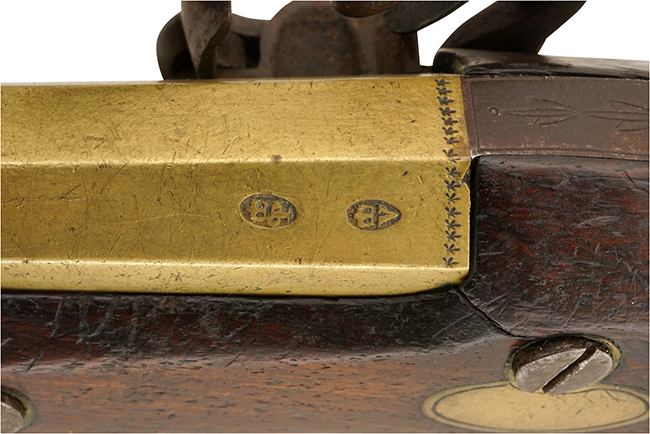 本品の真鍮製の銃身やトリガー・ガードは適度な時代が付いた良い雰囲気となっており、鉄製のサイド・ロックについても、やや経年による褪色や時代錆は見受けられるものの、目立った欠損等は見られず、製造された時代を考慮すれば概ね良好な状態が保たれています。 木製の銃床についても、やや打ち傷や線傷が見られる他、銃床前半部の右側面に継ぎ木による古い補修痕が見受けられるものの、強度的には概ねしっかりとした状態が保たれています。