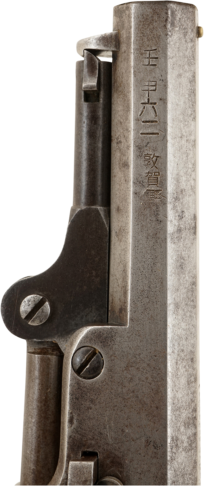 本品の銃身左側面には「壬申六二 敦賀縣」の壬申刻印が入っています。 「壬申刻印」とは古式銃の一種の戸籍番号に相当します。 明治4年に明治陸軍は主力小銃の統一化を図る為、旧藩に残る銃砲の種類、挺数の把握が急務となりました。 翌明治5年 (1872年、壬申) 1月から、太政官布告第28号第五則の「銃砲取締規則」によって、私蔵されていた銃砲の「我が国初の管理統制」が始まりました。 廃藩時に旧藩は旧家臣に軍用銃を下付した事例が多く見られ、旧士族の家には一挺の軍用銃があったとも言われています。 それらの銃はその後市中に大量に出回り私蔵されていました。 銃砲取締規則ではこれらの私蔵されていた銃砲について、管轄庁 (東京と大阪は武庫司) に持参して改刻印式によって番号、官印を受ける (これが明治5年度であれば壬申刻印と番号) 事が義務付けられました。 同時に管轄庁は同人名と番号を管轄鎮台に届け出て、鎮台より武庫司にそれらが提出される仕組みになっていました。 この調査は明治20年代頃まで銃砲調査が行われましたが、明治5年 (1872年=壬申) の調査が最も大々的に行われ、今日この種類の刻印の内90-95%が壬申の年に行われた事から、古式銃に打たれた漢字の刻印をまとめて「壬申刻印」と呼ばれています。 本品の壬申刻印に打刻されている敦賀縣 (敦賀県) とは、明治4年 (1871年) に越前国今立郡・南条郡・敦賀郡および若狭国一円の区域をもって発足した県で、1873年(明治6年)に足羽県が編入され、その範囲はほぼ現在の福井県全域に相当します。