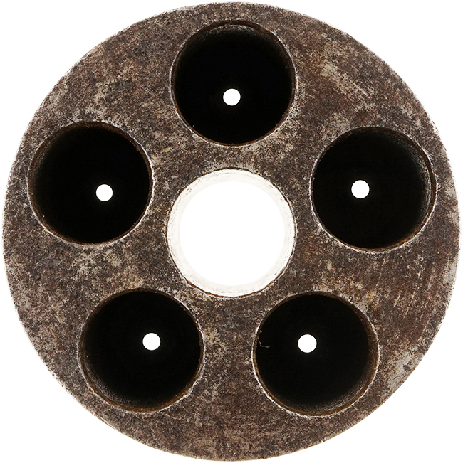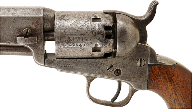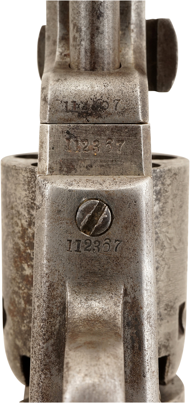 本品はフレーム、銃身、トリガー・ガード、バック・ストラップ、ローディング・レバー、シリンダー軸、バレル・ウェッジのシリアルNo.が(11)2367でマッチしています。 尚、シリンダーのシリアルNo.は51749となっています。 本品はシリアル No.から1856年製であることが判ります。 シリンダー表面の駅馬車 (Stagecoach) 強盗のロール・エングレービングは、一部表面錆痕が時代錆により見えにくくなっていますが、比較的良好に残っています。 また、シリンダーにはその他にも「COLTS PATENT」の文字やシリアル No.が確認出来ます。 フレームの左側面の「COLTS PATENT」の刻印については、「PATENT」部分の一部が確認出来ます。