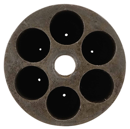 本品の銃身やフレーム、シリンダーといった金属部は全体に仕上げが落ちて金属の地肌が表れており、一部に打ち傷や時代錆、若干の朽込み痕が見受けられますが、大きな欠損等は見られず、比較的しっかりとした状態が保たれています。 グリップのフロント・ストラップに一部ひびが見られますが、強度的には影響のないレベルのものです。 真鍮製のトリガー・ガードは全体に磨かれていますが、やや打ち傷が見られる以外は現状目立った変形や腐食等は見受けられません。 木製 (ウォールナット製) グリップについても、やや打ち傷や線傷、角の部分の僅かな欠けの他、取り付け基部付近にやや痩せが見られるものの、大きな破損等は見られず、取り付けについてもがたつきもなくしっかりとしています。 ローディング・レバーは左右にやや遊びが見られますが、操作については問題なく、前方に戻した際のキャッチもしっかりと掛かります。 作動については完全で、ハンマーを起こすとシリンダーが歯切れ良く回転します。 銃身内は銃口から銃身後部まで完全に抜けて (通って) おり、若干の表面錆は見られるものの、ライフリングは比較的はっきりと確認出来ます。 パーカッション・ニップルには現状目立った欠けや変形は見られず、比較的良好な状態が保たれています。 (KK)