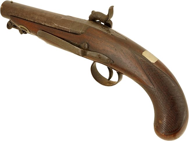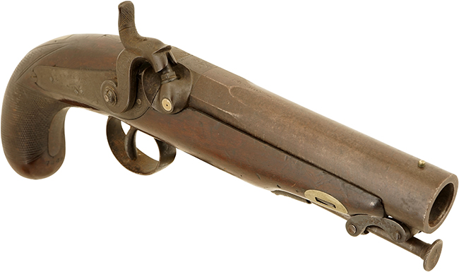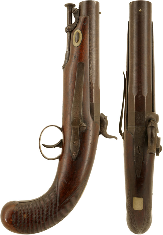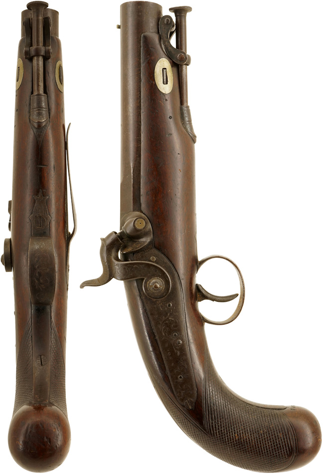 英国ロンドンのSamuel Nock (サミュエル・ノック) 社が1850年代頃に製造した、管打式 (パーカッション式) の単発拳銃です。 外見はスタンダードなTravel Pistol/Overcoat Pistolと呼ばれるタイプで、口径は16,5mmの大口径となっており、銃身は基部がオクタゴン (八角) 形状となったラウンド・バレルです。 銃身は内部にライフリング (施条) が施されていないスムース・ボア (滑腔銃身) となっています。 また、銃身先端下部にはスイベル式の鉄製ラム・ロッドが取り付けられています。 銃床左側面にはベルトに挟んで携行出来るよう、ベルト・フックが取り付けられています。