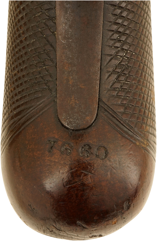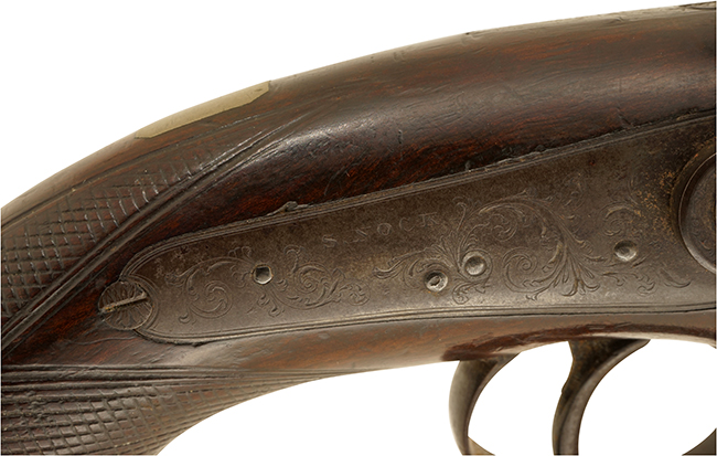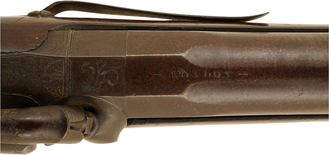 本品のロック・プレートには「S. NOCK」のメーカー名が入っており、銃身上面には「- LONDON -」の刻印が確認出来ます。 また、銃身裏面に王冠とVの文字を組み合わせたロンドン・プルーフ・ハウスのView Mark刻印及び王冠とGPの文字を組み合わせたDefinitive Proof刻印に加えて7660のシリアルNo.が入っており、グリップ前面にも7660のシリアルNo.が確認出来ます。 ロック・プレートやハンマー、トリガー・ガード、ラム・ロッド用のスイベル金具といった鉄部には精緻なスクロール・エングレービングが施されています。