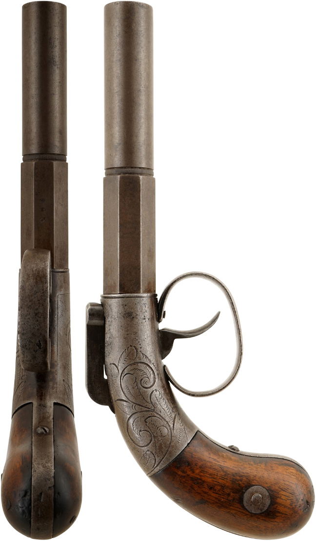 本品は1840年後半から50年代前半に製造された品と思われます。 南北戦争時はバックアップ用に使用されました。本体と銃身は白磨き仕上げになっており、表面上の時代錆はありますが、オクタゴン・バレルのエッジも立ったオリジナルの状態が良く残っています。 オリジナルのニス仕上げの木製(ウォルナット製)のグリップには小さな当たり傷が数ヵ所あるだけで、欠けも無く使用感はありますが美しい状態です。