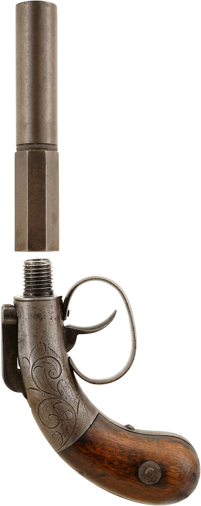 アレン バー・ハンマー シングル・ショット ピストルはアメリカのAllen & Thurber社(1837-56年)のBar Hammerパテントを使った小型単発のダブル・アクション ピストルです。 Allen & Thurber社はEthan Allen (1808年-1871年)が始めたE. Allend社(1831年-1837年)が母体となったアメリカで中堅のガン・メーカーです。 米国東海岸のNorwich(初期)とWorcester(後期)にありましたが、本品は時代的に Worcesterで生産された品と思われます。 Bar Hammerと呼ばれる中央に位置した独特のハンマーがダブル・アクションによって雷管を叩く管打ち式(Percussion)構造になっています。 このハンマーの側面に「Allens Patent」の刻印が入っています。 多くの連発のペパーボックスもこの「Allens Patent」を使っていますが、単発の品はあまり日本に入っていません。 これはこのタイプの小型ピストルは婦人の護身用としての用途が強く、幕末期の日本ではそれほど需要がなかったためと言われています。 銃身の基部から半分弱ほどはオクタゴン・バレルで銃口に向かって残り半分強がラウンド・バレルとなっています。 銃身はオクタゴン・バレルの根元から捻じ込むようにフレームと固定します。 フレームの両面には唐草模様の彫刻が入り、全体的に白磨き仕上げになっています。 銃身は4in.の36口径です。(MM)