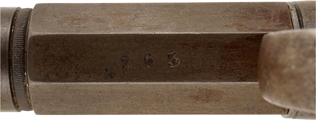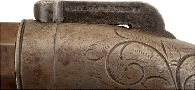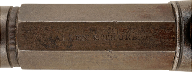 八角銃身の下に、シリアル No.263が入っています。銃身上面に「ALLEN&THURBER」、ハンマー左面に「ALLENS PATENT」の刻印がはっきりと入っています。銃身の取り外しも容易に可能です。トリガーを引くとダブル・アクションでハンマーを起き雷管(ニップル)を叩く、完全に作動する状態です。 フレームには彫刻もはっきりと残った程度の良い品です。 雷管(ニップル)の変形もなく完全です。銃身の中を見るとライフリングがハッキリと見えます。 4インチ銃身モデルは国内では少なく、弊社でも以前2インチ・モデルが入ったのみで4インチは初めての入荷です。 松本零士先生の膨大な古式銃コレクションの中で、本モデルはこれ一挺だけです。 東京店在庫品 (MM)