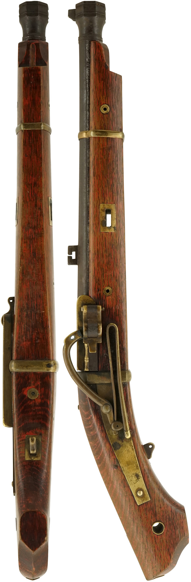 台 (銃床) については、経年使用の気にならない小傷や擦れが見られるものの、現状比較的しっかりとした強度も十分保たれています。 最初に朱漆を塗って砥ぎ、更に仕上げを施した木目に朱の縞模様を入れた仕上げになっています。 鋲裏座金等の金具についても欠品は見られず、総じてしっかりとした強度が保たれています。 カラクリの地板や火挟、弾金、胴金、雨覆、火蓋、引金といった真鍮部分についても、目立った傷等は見られず、良い時代色が付いています。