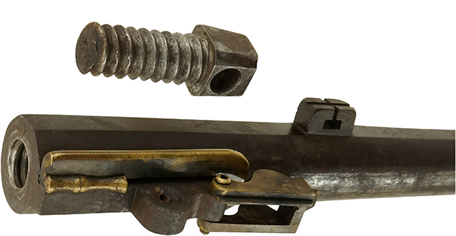 本品の筒(銃身)を含む鉄部は黒錆に覆われていますが、これは当時の日本における防錆方法であった錆付けによるもので、欧米のようにブルー仕上げがなかった日本では一般的なものでした。 銃身にはやや表面錆痕が見受けられるものの、大きな欠損等は見受けられず、概ねしっかりとした状態が保たれています。 銃身下部の目釘金具と銃床の目釘穴の位置は二ヵ所とも一致しています。