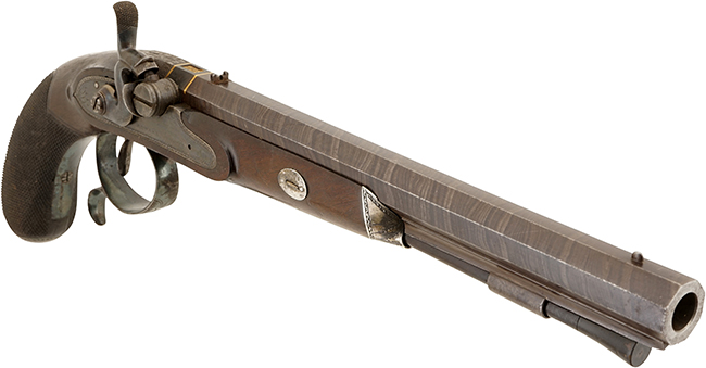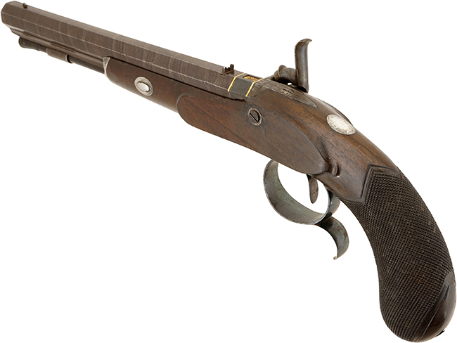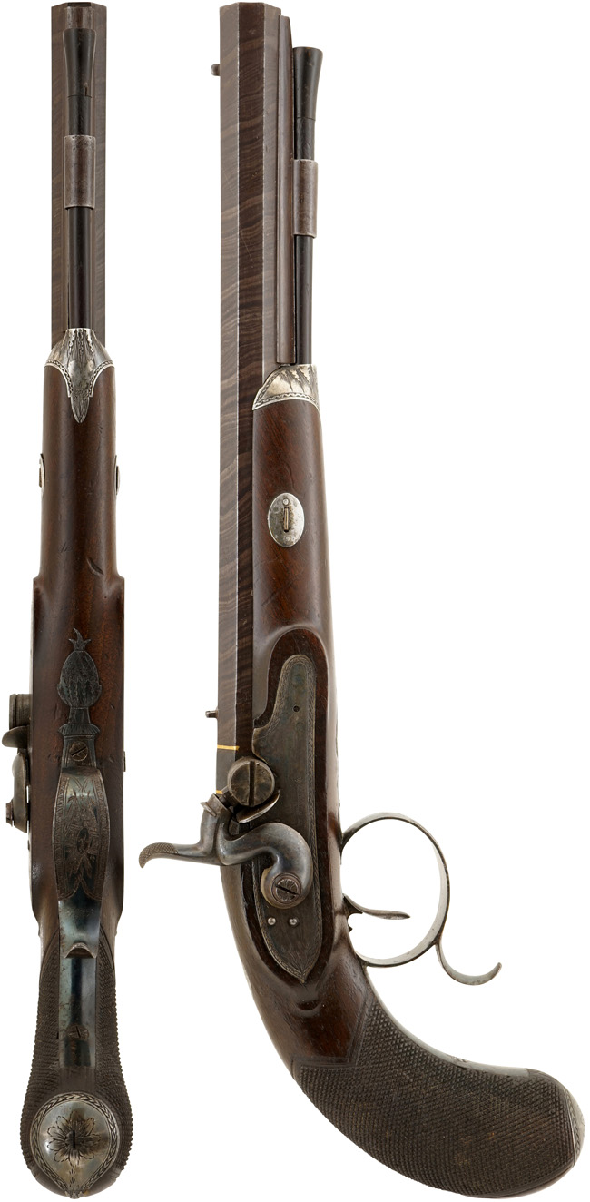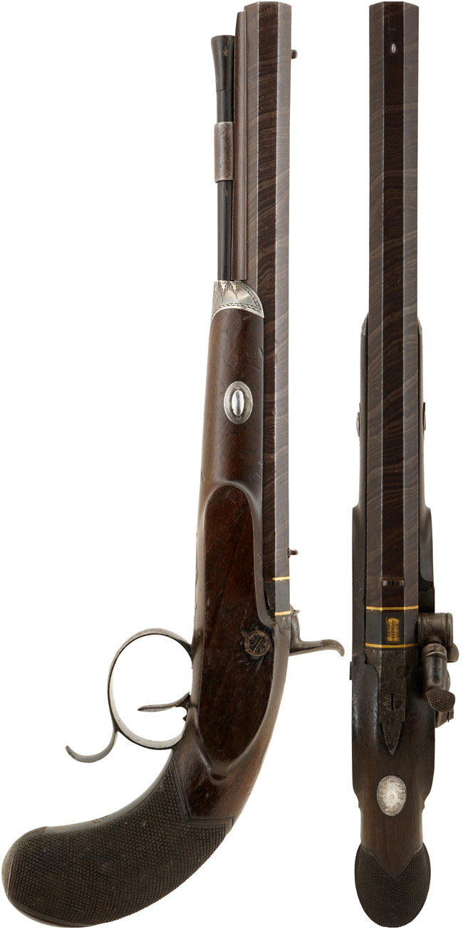 アイルランドのダブリンで1820-30年頃に製造されたパーカッション(管打ち式) シングル・ショット ピストル(単発拳銃)です。 全長が約398mmの大型サイズで、形状からドゥエリング・ピストル(Duelling Pistol、決闘用)と呼ばれる二挺セットの内の一挺です。 銃身長約263mmのダマスカス模様が入った重厚なオクタゴン(八角形)銃身は、口径約12.5mmのスムース・ボアの大口径になっています。ストックは銃身の約半分をカバーしているハーフ・ストックに近いものですが、銃身の下に銃口付近まで伸びたスペーサーとラム・ロッドを通す短い金属製チューブが付いているので、銃身がハーフ・ストックから飛び出した感じにはなっていません。またオリジナルのラム・ロッドは本体が木製で先端が掃除布用の鉄製工具が付いており、外部に出る銃口側は先端は獣角のような材質になっています。 グリップにはチェッカーリングが入っています。 ハンマーの前のニップル基部に大きなネジ式蓋が付いたコンパートメントがある珍しい品です。 トリガー・ガードの後方下部に握りやすくするための突起のがあり決闘用の特徴とも言われています。アイルランド製の古式銃は少なくThomas Fowler社はアイルランドを代表する銃工房です。 Thomas Fowler社は1700年代のフリントロックの時代から24 Suffolk Street, Dublinで営業を続けていた歴史あるアイルランドの銃メーカーの一つです。Thomas Fowler社製のフリント・ロック ピストルで本品に非常に似た品がありますので、パーカッション・ロックに撃発機構が変わってから直ぐの1820年代に作られた可能性が高いです。