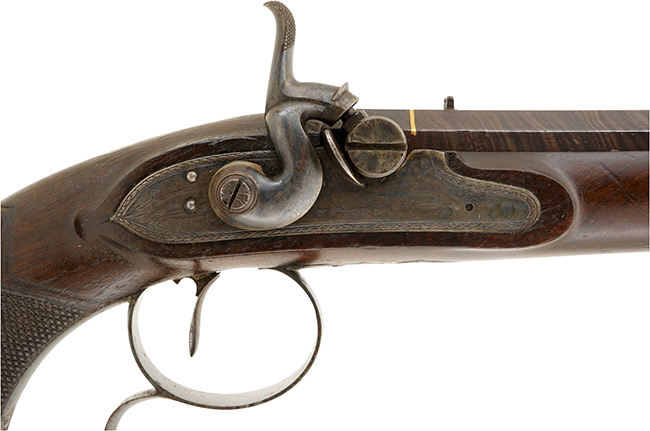 本品の全体的な程度は古式銃としては非常に良い方です。 木部は経年の僅かな小傷が見られるものの、金属部は銃身、機関部(サイド・プレート、ハンマーなど)、トリガー・ガードなど全体的にオリジナルの仕上げが残った退色が少ない状態です。 またサイド・プレート、トリガー・ガード、ハンマーにはケースハードン仕上げが残っています。トリガー・ガードとアッパー・タング、銃身の最後端には緻密な英国風の模様(一部が果実を意匠化したような文様)の彫刻が施されており、それらも完全に残った美しい品です。 サイド・プレートには手の凝った羽根が連続して続いたようなボーダーで飾られ、植物を意匠化した模様が後部に入っています。 ハンマーの前には「FOWLER」のメーカー刻印がハッキリと刻まれています。 ダマスカス銃身後部には11mm幅のブルー仕上げになった部分があり、そこに二本の金象嵌の線ボーダーが入っています。 その中央の長方形に凹んだ部分に「THOMAS FOWLER DUBLIN」とメーカー名と所在地名が浮き彫りにされて入っており、その部分が金鍍金された非常に手の凝った作りになっています。 シリアルナンバーと思われる334の刻印が銃身を外した木製の銃床内部と銃身、尾栓の計3箇所に確認でき、当初からマッチした部品であることが伺われます。 ダマスカス銃身はリボン状の模様がハッキリと残っています。 上記の銃身基部近くに金象嵌の二本のラインがあり、美しく光って本品のアクセントになっています。 オリジナルの仕上げが良く残った上質のウォルナット製グリップはチェッカーリングを含め全体的に良い状態を保っています。 グリップ後方の背にあたる部分に銀製の楕円形金物(本来なら家紋やイニシャルを入れます)が付いています。 グリップ下部のグリップ・エンド・キャップ(楕円形金物)とストック先端のラム・ロッドの入口金物は彫刻の入った美しい洋銀製になっています。 ネジの一本に至るまで緻密な模様で飾られた高級品です。
