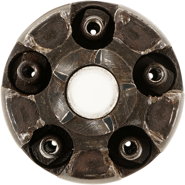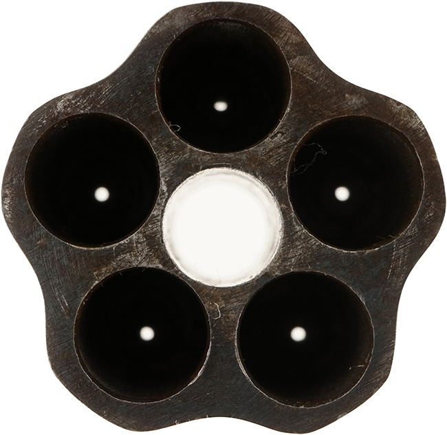 銃身とフレームの取り付けについては現状がたつきは殆ど見られず、シリンダーの前後の遊びやローディング・レバーの左右の遊びについても十分許容レベルです。 ローディング・レバーのキャッチについてもしっかりと掛かります。 作動については問題なく、ハンマーのハーフ・コック及びフル・コックもしっかりと掛かります。 フル・コック位置でトリガーを引くことによりハンマーがスムーズかつ力強く落ちます。 銃身内は銃口から薬室まで完全に抜けて (通って) おり、錆なども殆ど見られず、ライフリングも深くはっきりと残っています。 シリンダーのパーカッション・ニップルについても大きな欠けや変形等は見受けられず、良好な状態が保たれています。 (KK)