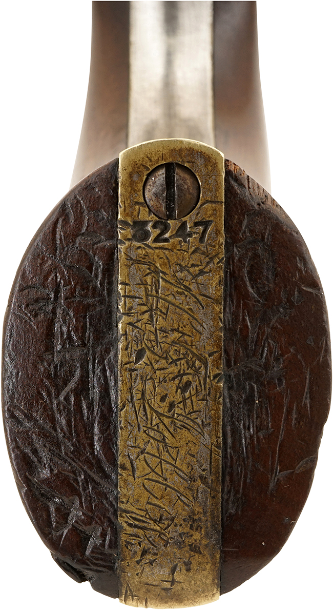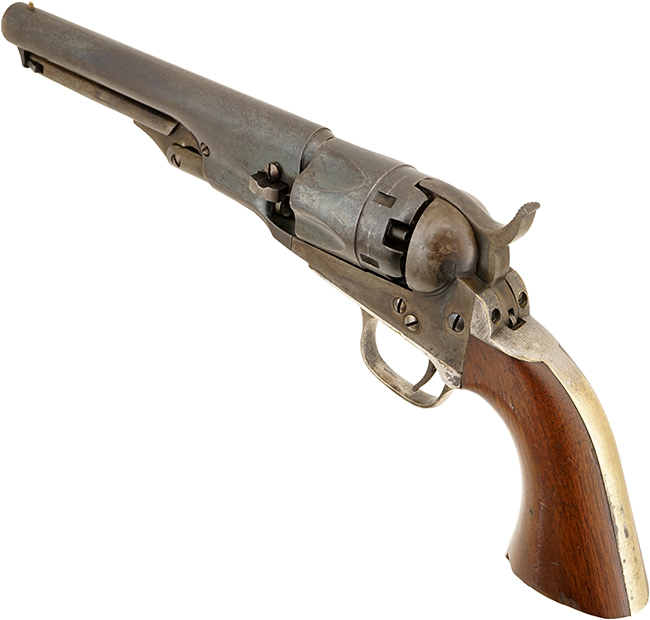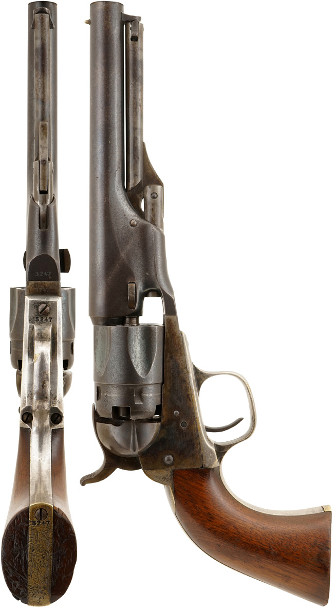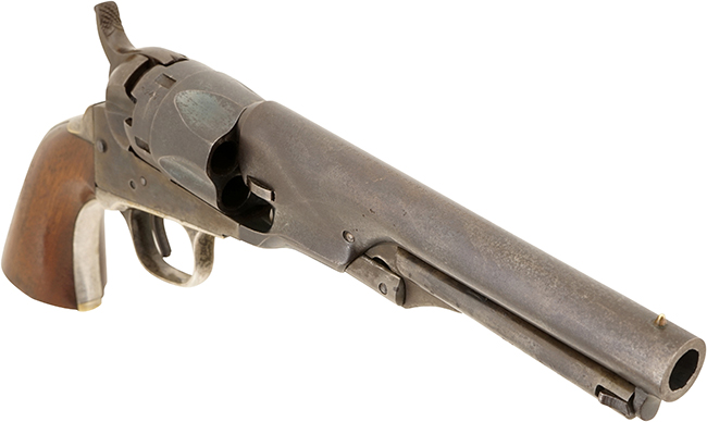 本品は古式銃としては非常に良好な状態が保たれており、フレームやローディング・レバー、ハンマーにはオリジナルのケース・ハードン仕上げが良好に残っています。 銃身やシリンダーについても、やや擦れや表面錆、経年による褪色は見られますが、こちらも目立った欠損や朽ち込み等は見られず、オリジナルのブルー仕上げも比較的残っています。 真鍮製のトリガー・ガードやバック・ストラップについては、適度な時代が付いた良い雰囲気となっており、バット・ストラップ下面にやや打ち傷が目立ちますが、現状目立った変形や腐食は見られず、トリガー・ガードにはオリジナルの銀鍍金仕上げが大部分に残っています。 オリジナルの木製 (ウォールナット製) グリップについては、角の部分に僅かな欠けが散見され、グリップ右側面下部に若干のひびが見られるものの、大きな欠損は見られず、グリップ・フレームへの取り付けについても、ガタつきもなくしっかりとしています。