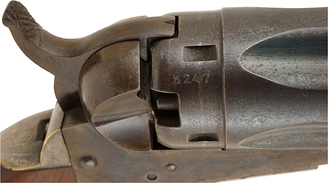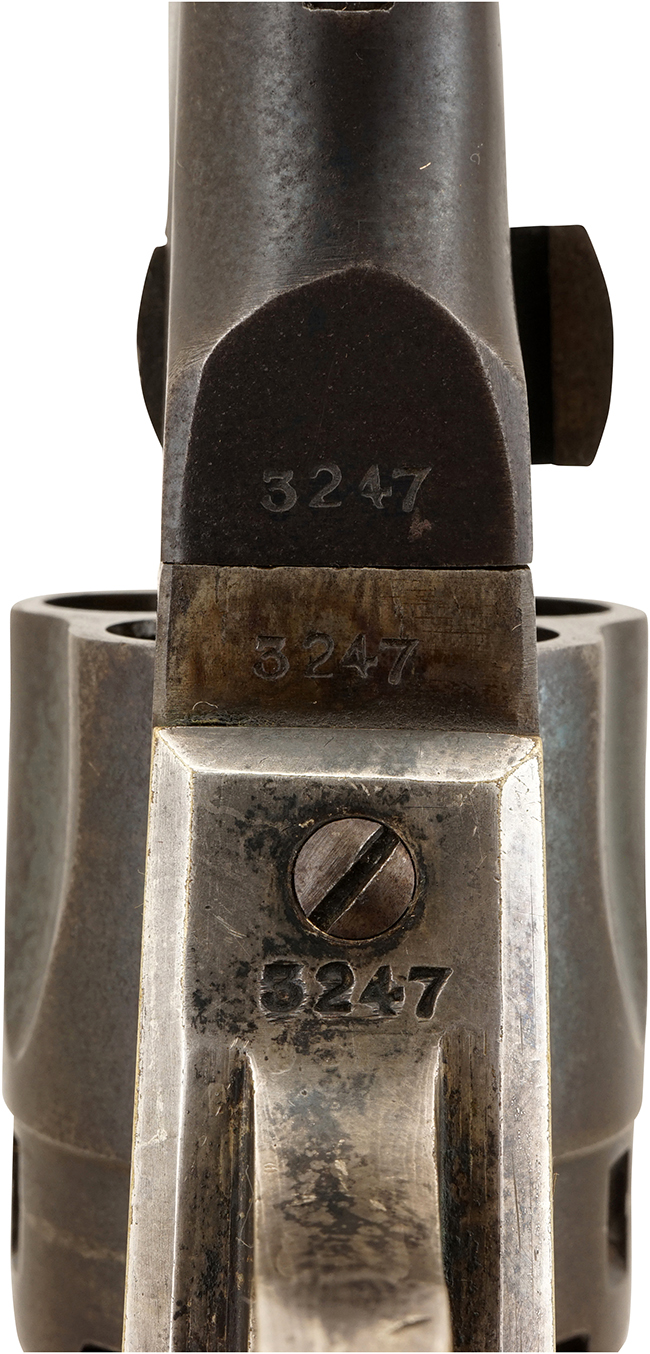 本品のシリアルNo.は3247で、銃身上面には「METROPOLITAN ARMS Co. NEW-YORK」のメーカー刻印が入っています。 シリアルNo.は銃身、フレーム、トリガー・ガード、バック・ストラップ、シリンダー、ローディング・レバーが(32)47でマッチしています。 バレル・ウェッジのシリアルNo.は3218となっています。