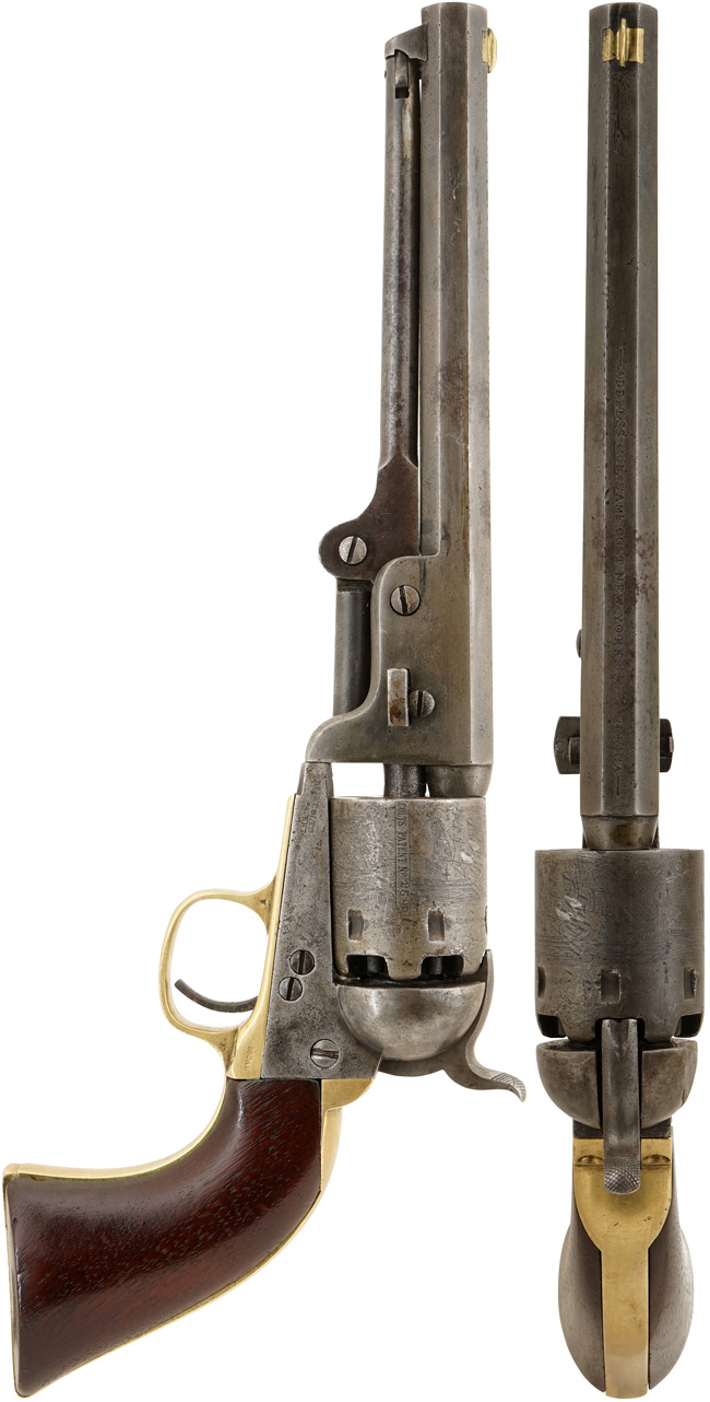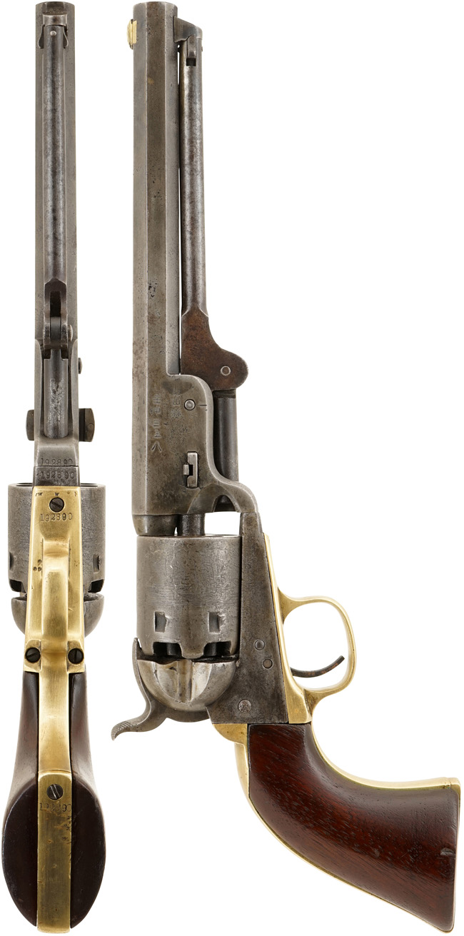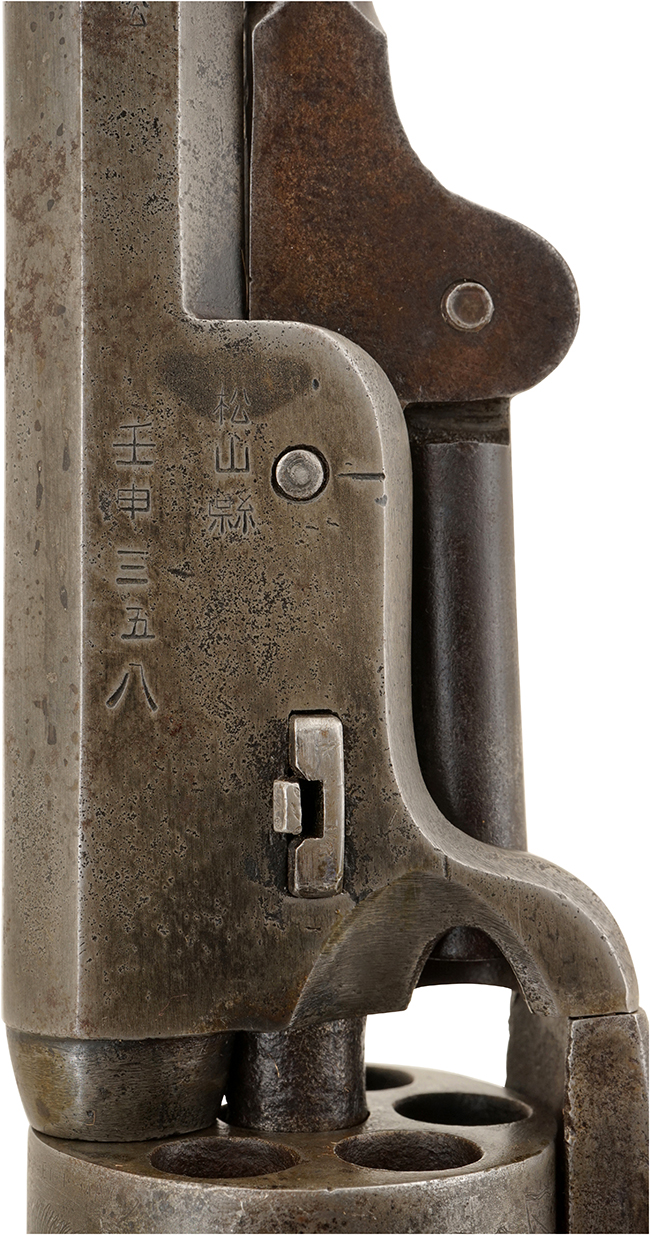 本品の金属部は全体的に経年による褪色や若干の表面錆痕が見受けられ、一部に若干の朽ち込み痕が見られるものの、目立った欠損等は見られず、古式銃としては良い雰囲気となっています。 本品の銃身基部右側面には「松山縣 壬申 三五八」の壬申刻印が入っています。 「壬申刻印」とは古式銃の一種の戸籍番号に相当します。 明治4年に明治陸軍は主力小銃の統一化を図る為、旧藩に残る銃砲の種類、挺数の把握が急務となりました。 翌明治5年 (1872年、壬申) 1月から、太政官布告第28号第五則の「銃砲取締規則」によって、私蔵されていた銃砲の「我が国初の管理統制」が始まりました。 廃藩時に旧藩は旧家臣に軍用銃を下付した事例が多く見られ、旧士族の家には一挺の軍用銃があったとも言われています。 それらの銃はその後市中に大量に出回り私蔵されていました。 銃砲取締規則ではこれらの私蔵されていた銃砲について、管轄庁 (東京と大阪は武庫司) に持参して改刻印式によって番号、官印を受ける (これが明治5年度であれば壬申刻印と番号) 事が義務付けられました。 同時に管轄庁は同人名と番号を管轄鎮台に届け出て、鎮台より武庫司にそれらが提出される仕組みになっていました。 この調査は明治20年代頃まで銃砲調査が行われましたが、明治5年 (1872年=壬申) の調査が最も大々的に行われ、今日この種類の刻印の内90-95%が壬申の年に行われた事から、古式銃に打たれた漢字の刻印をまとめて「壬申刻印」と呼ばれています。 本品の壬申刻印に打刻されている松山縣 (松山県) とは、明治4年 (1871年) 廃藩置県により旧伊予松山藩から置き換えられた県で、のちに石鉄県を経て愛媛県に編入されました。 シリンダー表面にはやや表面錆痕や時代錆が見られ、カンペチェ海戦の彫刻が甘くなっています。 シリンダー側面のパテント刻印やシリアルNo.については、はっきりと判読可能です。 本品は銃身、フレーム、トリガー・ガード、バック・ストラップ、シリンダー、シリンダー軸とのシリアルNo.が(19)289(0)でマッチしています。 ローディング・レバーにシリアルNo.が入っていない事から、本品が米国内向けに製造された事が窺えます。 フレームの左側面には「COLTS PATENT」の刻印が確認出来、銃身の上には細かい文字で「-ADDRESS COL. SAML COLT NEW-YORK U.S. AMERICA-」のメーカー刻印が一行で打ち直しにより入っています。 真鍮製のトリガー・ガード及びトリガー・ガードから続くフロント・ストラップとバック・ストラップは、全体に磨き直しが行われており、やや打ち傷等が散見されますが、現状目立った変形や腐食等は見受けられません。 ローディング・レバーはやや左右に遊びが見られますが、概ね許容レベルで、キャッチもしっかりと掛かります。 また、コルト製パーカッション・リボルバーの構造上の持病とも言える、銃身とフレームの取り付けの遊びについては、現状殆ど見られません。 木製 (ウォールナット製) グリップについては、全体に仕上げ直しが施され、ややフレームに対して痩せが見られますが、現状大きな破損やがたつきなどは見受けられません。