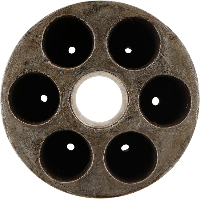 作動については完全で、ハンマーのハーフ・コック及びフル・コックもしっかりと掛かり、シリンダーも正常に回転します。 フル・コック位置でトリガーを引く事により、ハンマーがスムーズに落ちます。 銃身内はやや表面錆が見られるものの、ライフリングは比較的はっきりと残っており、銃口から薬室まで完全に抜けています。 シリンダーのパーカッション・ニップルについても大きな欠けや変形等は見受けられず、比較的良好な状態が保たれています。 シリンダーの前後の遊びについても比較的少なく、十分許容レベルです。 (KK)