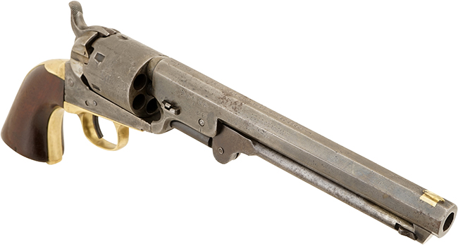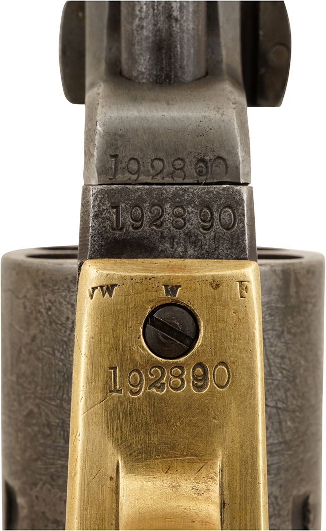 1851 ネービーは1850年から1873年まで生産され、1st Modelから Late 4th Modelまで小さな違いではありますがバリエーションが存在します。 本品はシリアル No.が概ね166000から215367までのLate 4th Modelと呼ばれるモデルです。 Late 4th Modelは、1863年から1864年にかけて製造された後、1864年2月4日のコルト社の工場火災による一次的な製造中断を挟んで1873年まで生産されました。 本品はシリアルNo.からコルト社が火災からの復興中に生産した品である事が窺えます。