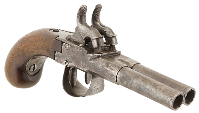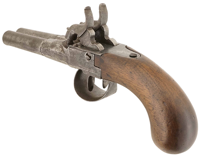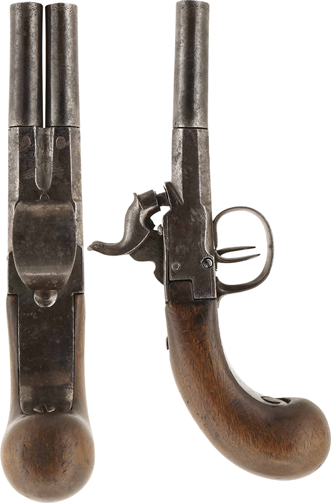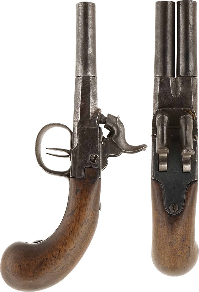 19世紀中頃に英国で作られた小型のパーカッション・ロック(管打ち式)の水平二連拳銃です。 銃身長が約8.4cmのライフリングのない装滑腔ラウンド (丸形) バレルを二本並べた品です。木製銃床のグリップは左右がフラットになって下部が丸みを帯びています。