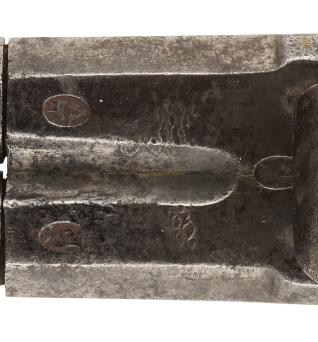 Old London Proof mark銃身が嵌る本体の片方に王冠P、もう片方に王冠V、トリガーガードの前に王冠Pの刻印があります。 左側のトリガーの形が表裏逆転しているように見えますが、これが正しい位置です。 トリガー・ガードがセーフティの役目をしており、トリガー・ガードを前後させてロック/セーフを掛けます。 しかしながら、本品はトリガー・ガードは前後しますが、ロックが掛かりません。 この様なトリガー・ガード兼用のセーフティは英国製だけに見られるシステムで、英国のメーカーが特許を持っていたと考えられます。
