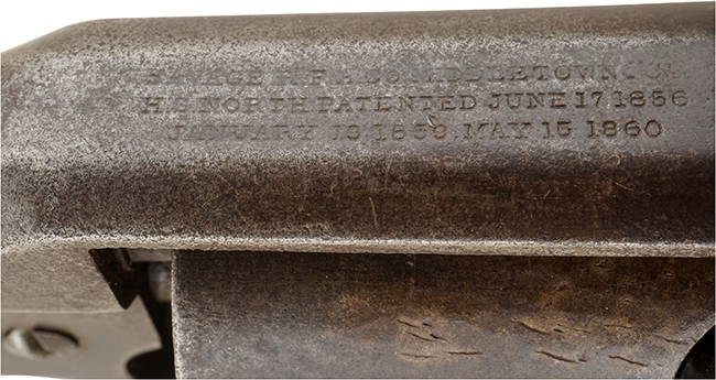 本品の銃身上面には「SAVAGE R.F.A Co. MIDDLETOWN. CT.」のメーカー刻印に加えて、ヘンリー・S・ノースのパテントを示す「H.S.NORTH PATENTED JUNE 17 1856 JANUARY 19 1859 MAY 15 1860」の刻印が打刻されています。 シリアルNo.は6319で、シリアルNo.はグリップ・パネルを外したグリップ・フレーム右側面に打刻されています。 グリップ・パネル左側面には、やや薄くなっており判読が難しいものの、米国陸軍のインスペクター花押とも呼べる、イニシャルが入った刻印 (Cartouche=カートゥーシュ) が打刻されているのが確認出来る事から、本品が米国陸軍に納入された内の1挺である事が判ります。