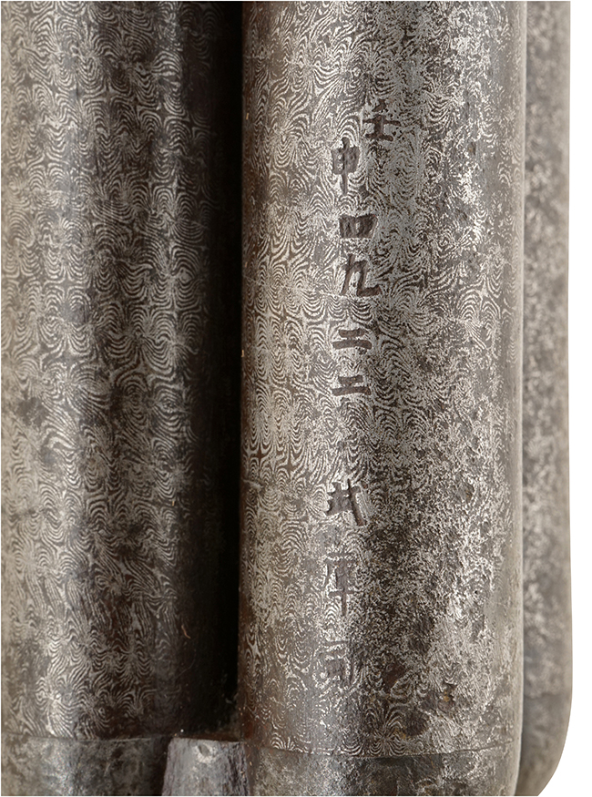 「壬申刻印」とは古式銃の一種の戸籍番号になります。 明治4年に明治陸軍は主力小銃の統一化を図る為、旧藩に残る銃砲の種類、挺数の把握が急務となりました。 翌明治5年 (1872年、壬申) 1月から、太政官布告第28号第五則の「銃砲取締規則」によって、私蔵されていた銃砲の「我が国初の管理統制」が始まりました。 廃藩時に旧藩は旧家臣に軍用銃を下付した事例が多く見られ、旧士族の家には一挺の軍用銃があったとも言われています。 それらの銃はその後市中に大量に出回り私蔵されていました。 銃砲取締規則ではこれらの私蔵されていた銃砲について、管轄庁 (東京と大阪は武庫司) に持参して改刻印式によって番号、官印を受ける (これが明治5年度であれば壬申刻印と番号) 事が義務付けられました。 同時に管轄庁は同人名と番号を管轄鎮台に届け出て、鎮台より武庫司にそれらが提出される仕組みになっていました。 この調査は明治20年代頃まで銃砲調査が行われましたが、明治5年 (1872年=壬申) の調査が最も大々的に行われ、今日この種類の刻印の内90-95%が壬申の年に行われた事から、古式銃に打たれた漢字の刻印をまとめて「壬申刻印」と呼ばれています。 本品は「壬申 四九二二 武庫司」の刻印が入っている事から、明治5年に武庫司(東京)に届け出が行われた品である事が判ります。