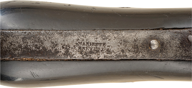 本銃は1850年後半頃に製作された、かなり大型の部類に入るペッパーボックスです。 口径についても16mmと一般的なベルギー製ペッパーボックスの口径である9mmに比べてかなり大きく、重量も重くなっています。 本体の鉄部は当時から白磨き仕上げだったと思われ、それに表面上の時代錆のくすみがグレーのパティーナとして付いた状態です。 しかしながら、再仕上げされていないオリジナルの状態で、目立った朽ち込み等は見受けられません。 木製グリップはエボナイズド仕上げ (ebonized wood) と呼ばれる黒檀風の仕上げで、下部が丸みを帯びたバグ・タイプ・グリップと呼ばれる形状となっており、目立った傷は見られません。 銃身はペッパーボックスとしては長い、銃身長15cmの上質なダマスカス模様が確認できるラウンド・バレルになっています。 フレームなどにオリジナルのハッキリとした唐草模様の彫刻が入っています。 グリップ・ストラップ下部 (内側) には、「MARIETTE, BREVETE」(Brevete=Patent=特許) 及び "MARIETTE" の刻印が二行にわたって入っており、ギヨーム マリエット社の特許が使用されていることが判ります。 その下には「655」のシリアルNo.が入っています。 尚、ソケット部分には楕円形の中に「ELG」の文字が打たれたリェージュのプルーフ・ハウス刻印も確認出来ます。