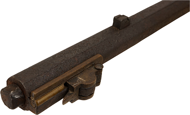 本品の筒(銃身)を含む鉄部は黒錆に覆われていますが、これは当時の日本における防錆方法であった錆付けによるもので、欧米のようにブルー仕上げがなかった日本では一般的なものでした。 銃身全体に朽込錆があります。 銃身下部の目釘金具と銃床の目釘穴の位置は一致しています。