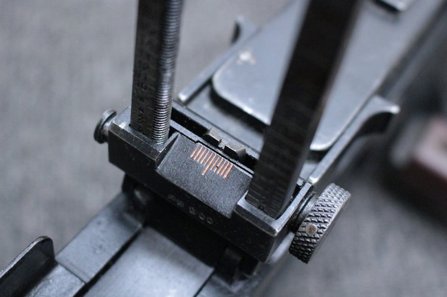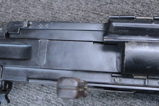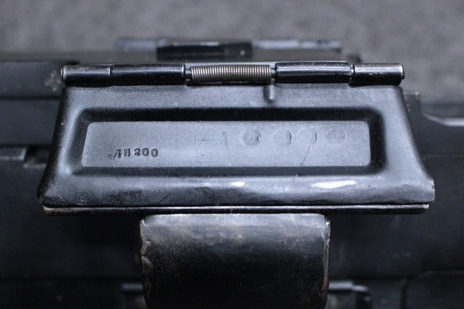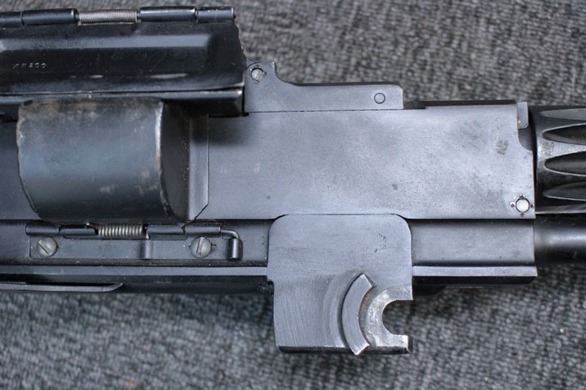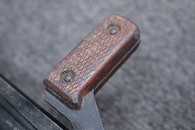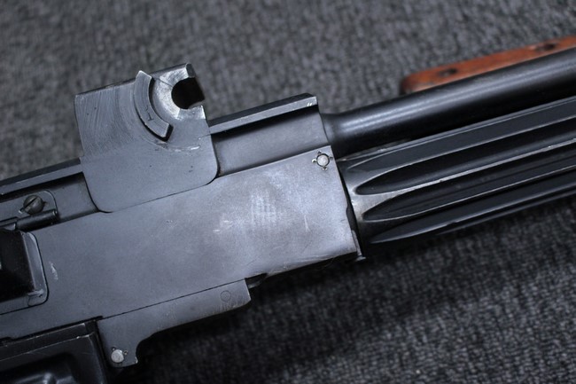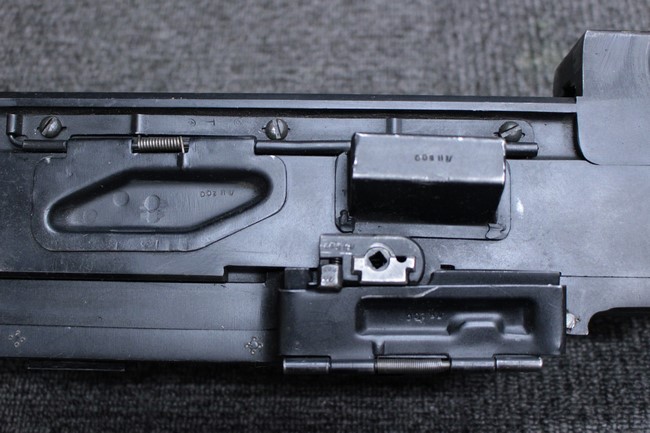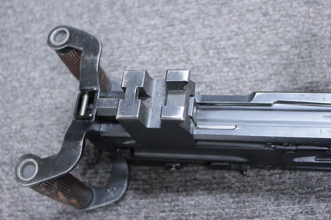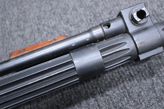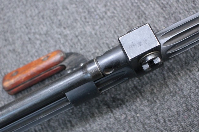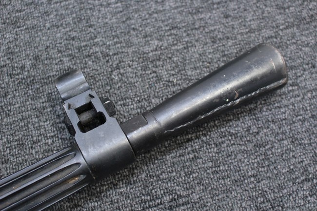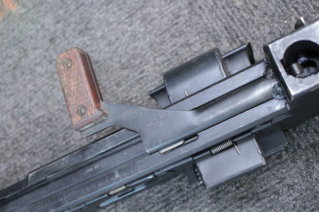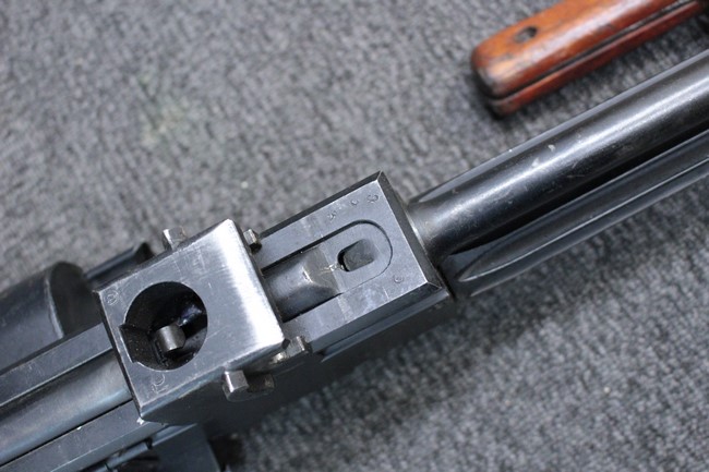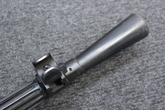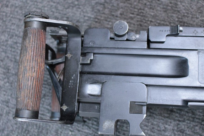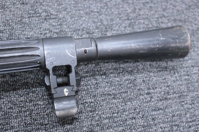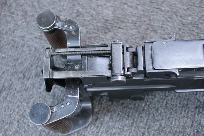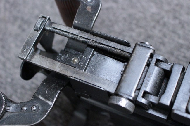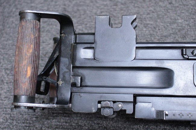 銃本体の金属部は若干の擦れや小傷は見受けられるものの、全体に黒色の表面仕上げが良好に残っています。 また、木製のスペード・グリップやコッキング・ハンドル、キャリング・ハンドルについても、若干の打ち傷や小さな欠け等が見受けられるものの、目立った破損等は見受けられません。 スペード・グリップ内部のオイル・ブラシについても左右共に欠損せず残っています。 通常射撃用のリア・サイトについては起倒操作やエレベーション調整及びウィンデージ調整等を問題なく行う事が可能です。