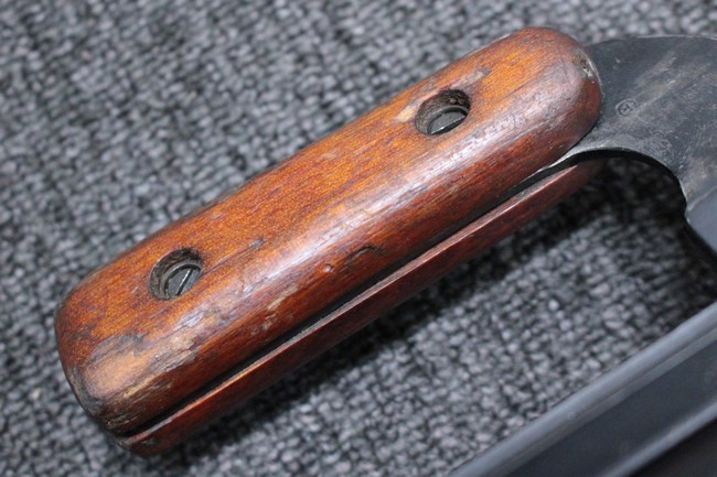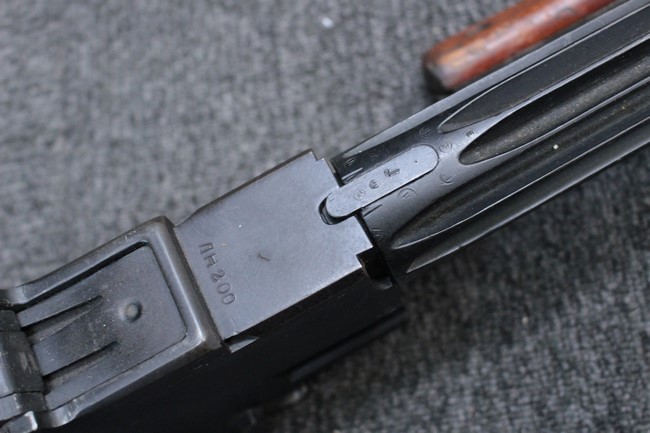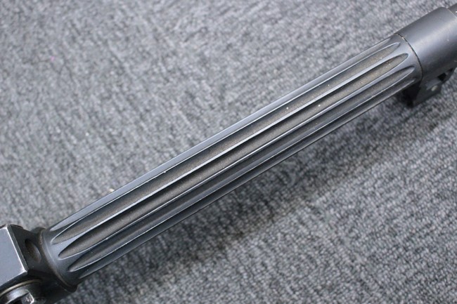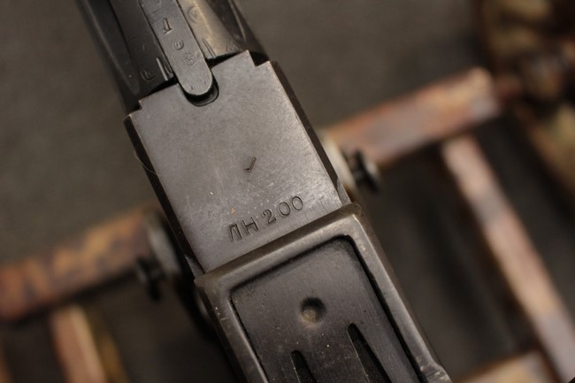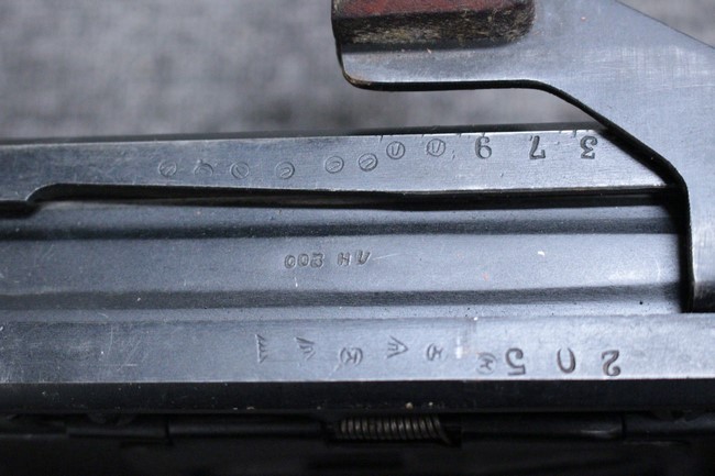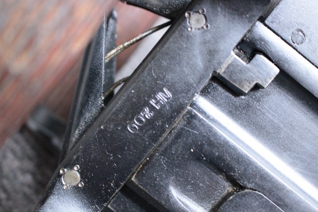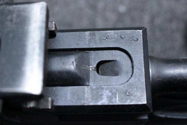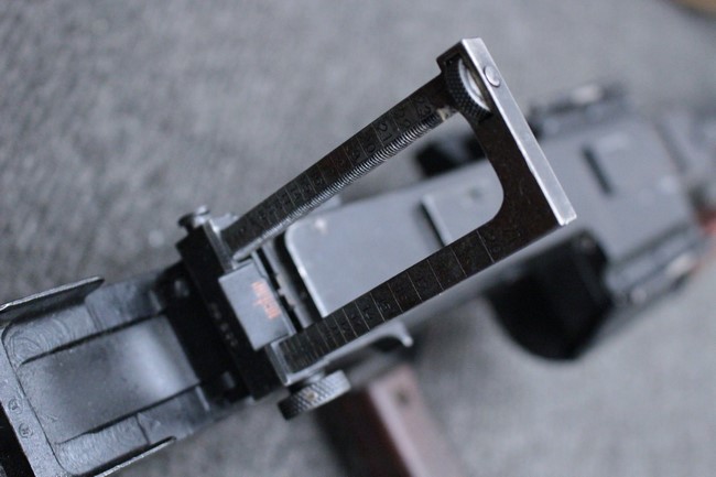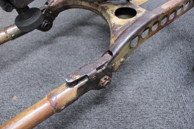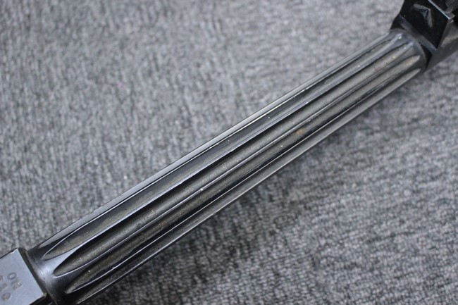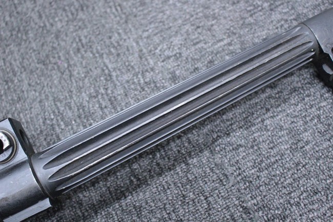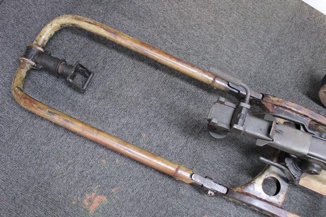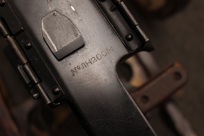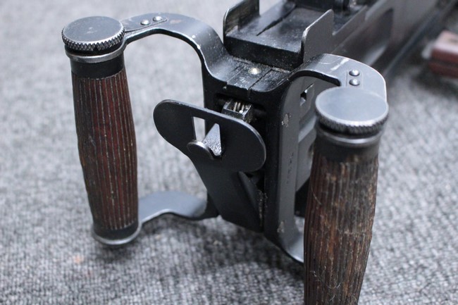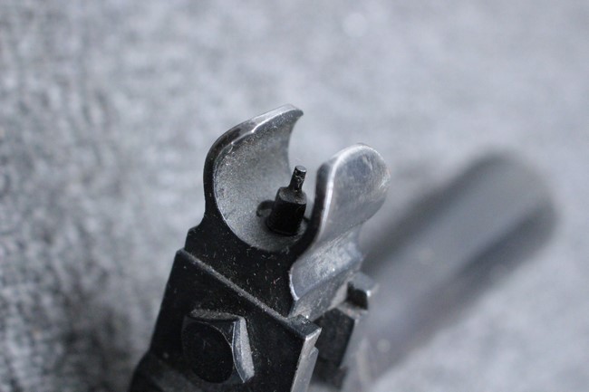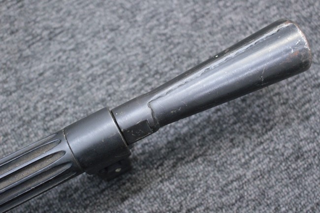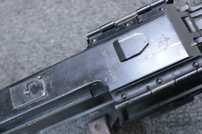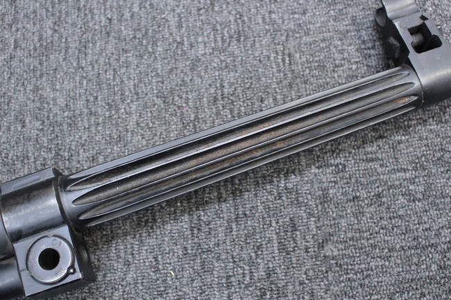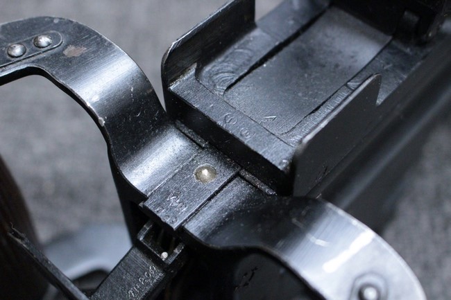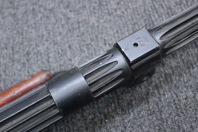 銃本体の金属部は若干の擦れや小傷は見受けられるものの、全体に黒色の表面仕上げが良好に残っています。 また、木製のスペード・グリップやコッキング・ハンドル、キャリング・ハンドルについても、若干の打ち傷や小さな欠け等が見受けられるものの、目立った破損等は見受けられません。 スペード・グリップ内部のオイル・ブラシについても左右共に欠損せず残っています。 通常射撃用のリア・サイトについては起倒操作やエレベーション調整及びウィンデージ調整等を問題なく行う事が可能です。