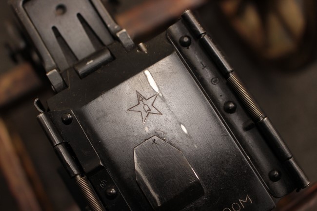 本品はソ連製オリジナルのSGM重機関銃で、対空射撃姿勢でも使用可能な銃架が付属しています。 シリアルNo.はレシーバーやコッキング・ハンドル、グリップ基部、ダスト・カバー等でマッチしています。 機関部には星に矢の第385工場(ズラトウースト、現:ZLATMASH)の刻印が確認できます。