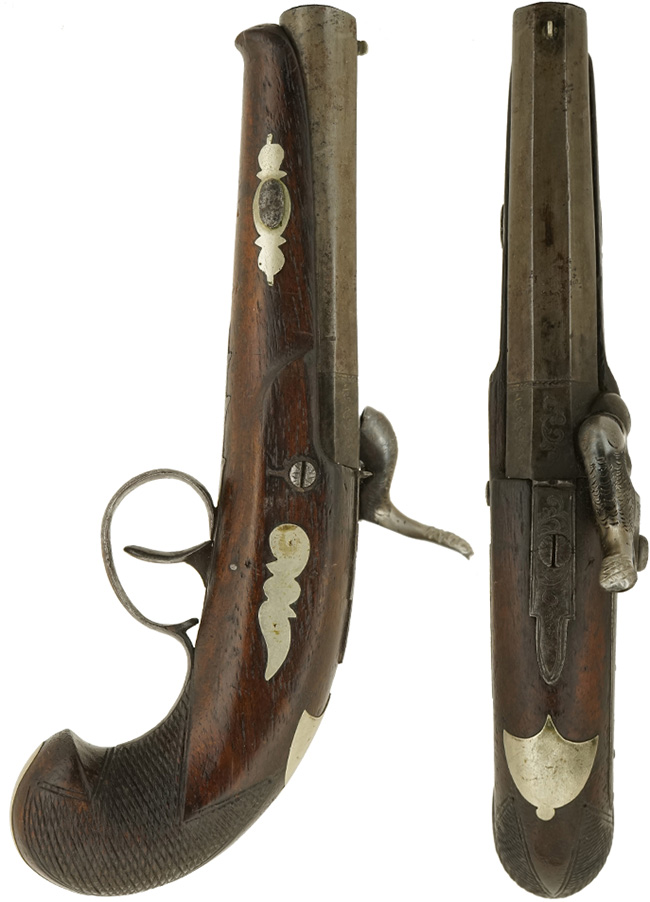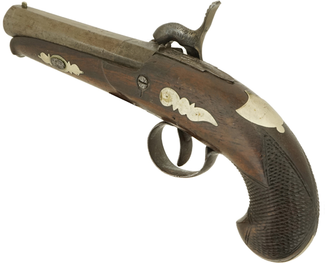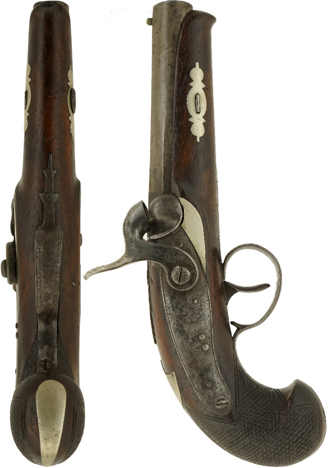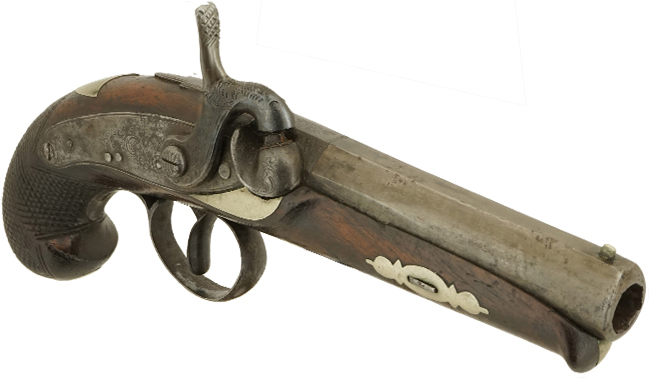 英国で製造された、デリンジャー・タイプの小型の単発管打式 (パーカッション式) 拳銃です。