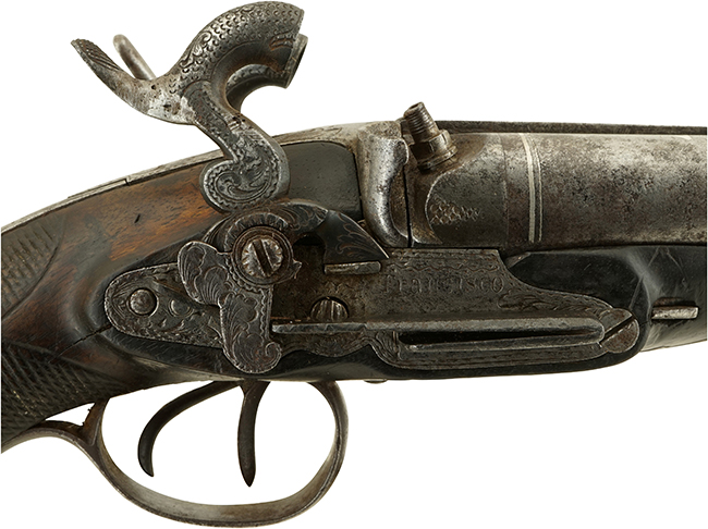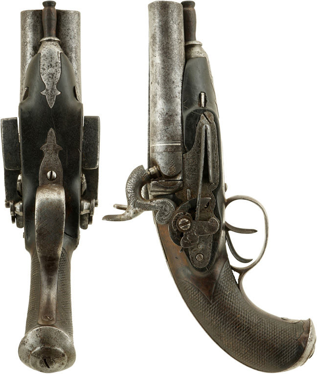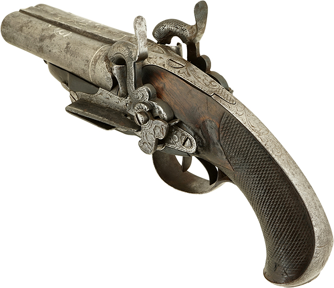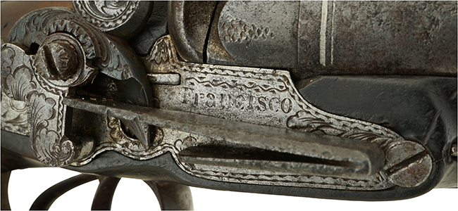 本品の作りは当時のスペイン製らしいもので、アラベスク模様が銃身上面に銀象嵌入ったラウンド (丸形)・バレルを左右に二本並べてた水平二連型となっています。 全体的に小柄にも拘わらず18mmの大口径銃身になっています。 小さいながらも相手に大きなダメージを与えるストッピング・パワーを重視した品で、実際に構えてみると近距離であれば必ず命中しそうな印象を受けます。 本品はハンマー全体が「イルカのような形状」になっており、尚且つハンマーとしての強度も十分あります。 十雨床の先端 (ラム・ロッドが入る部分) には補強用のリブが付いたラム・ロッド・パイプが取り付けられています。 アッパー・タング後方のバック・ストラップはグリップ下部まで延びており、木製銃床の強度を高めています。 至近距離での使用を想定していたためか、フロント・サイト及びリア・サイトは当初から備えていません。 ミュクレット式の水平二連拳銃は国内では少なく、何百もの古式銃を見てきた弊社でも初めての品です。 (MM)(KK)
