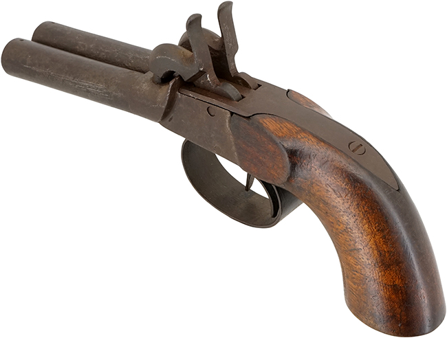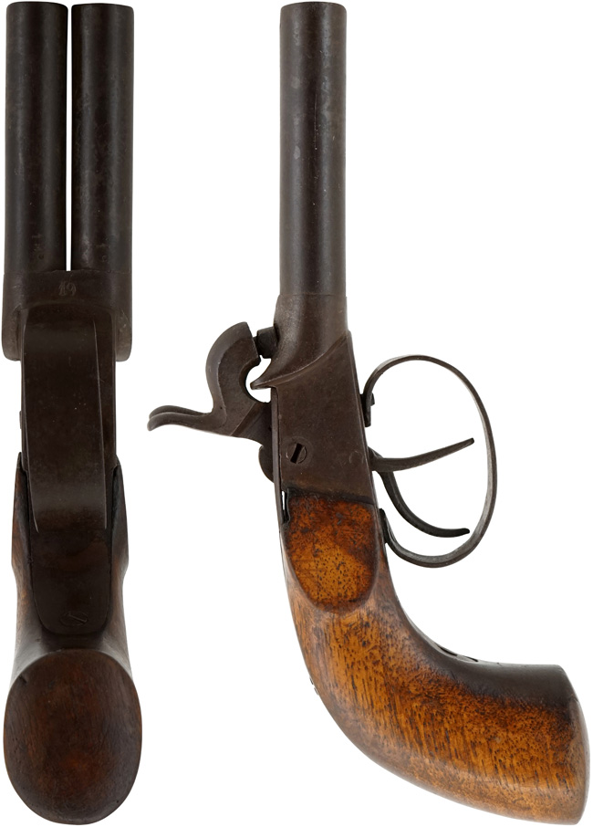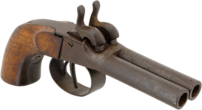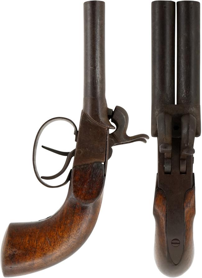 ヨーロッパで1850年代頃に製造されたと考えられる、水平二連銃身を備えた管打ち式 (パーカッション式) の小型拳銃です。 本品には生産国を示す刻印は確認出来ませんが、全体の作りからベルギー製の可能性が考えられます。