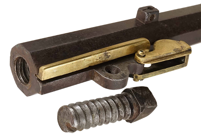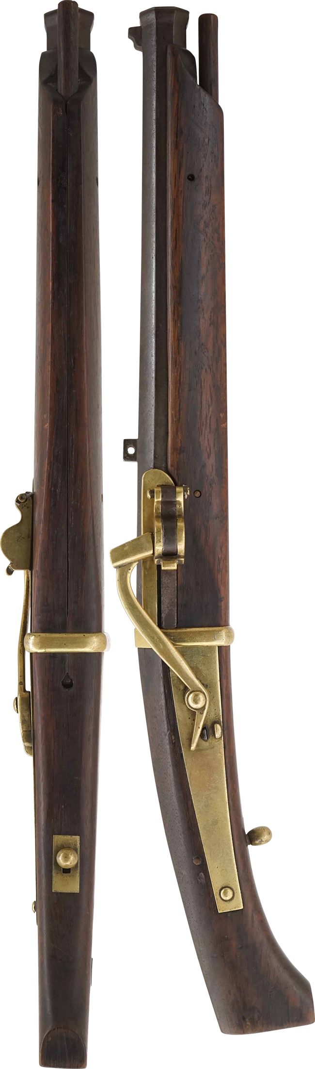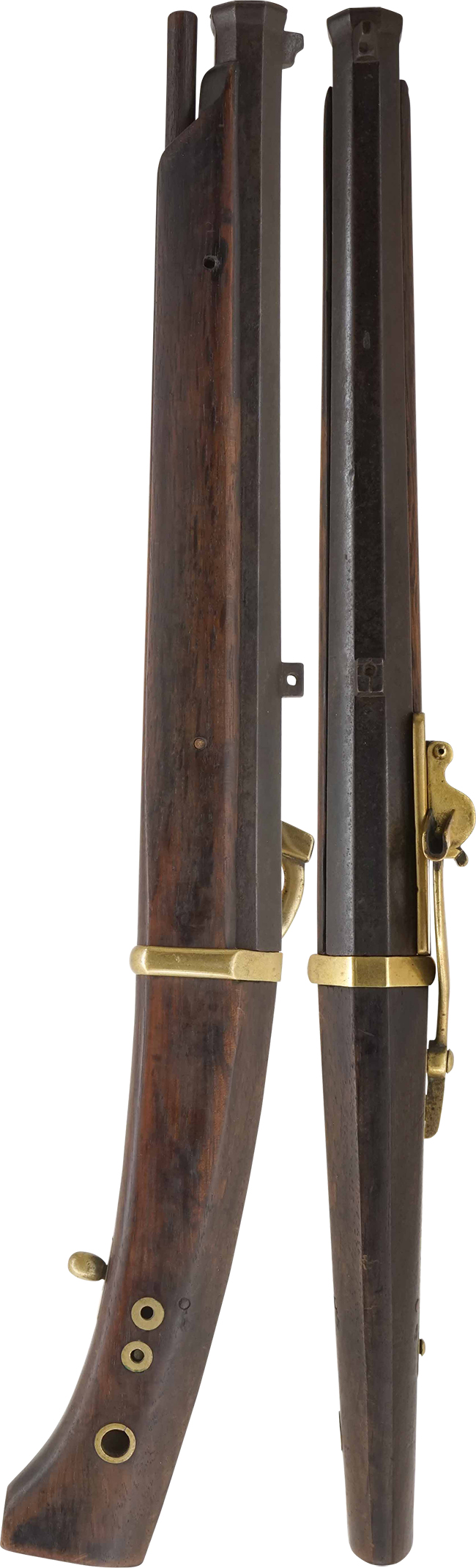 本品の筒(銃身)を含む鉄部は黒錆に覆われていますが、これは当時の日本における防錆方法であった錆付けによるもので、欧米のようにブルー仕上げがなかった日本では一般的なものでした。 銃身はしっかりとしており、鉄味の良さが判る状態が保たれています。 銃身下部の目釘金具と銃床の目釘穴の位置は二ヵ所とも一致しています。